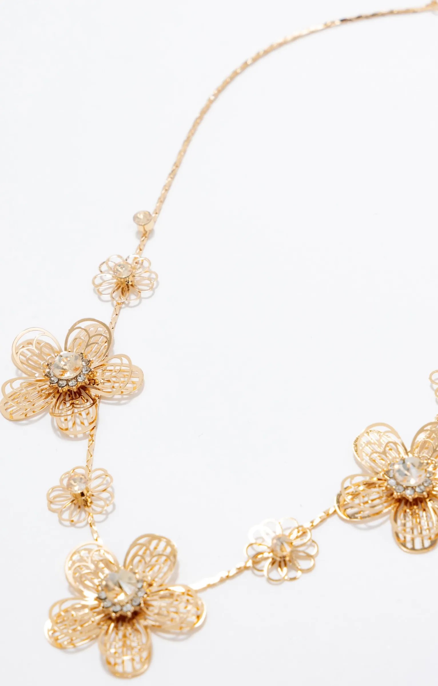 Collier à maillons fins avec pendentifs floraux ajourés de tailles variées. Fleurs en relief composées de pétales filigranés et ornées de strass au centre. Fermeture par mousqueton avec chaînette d’ajustement. Coloris uni.