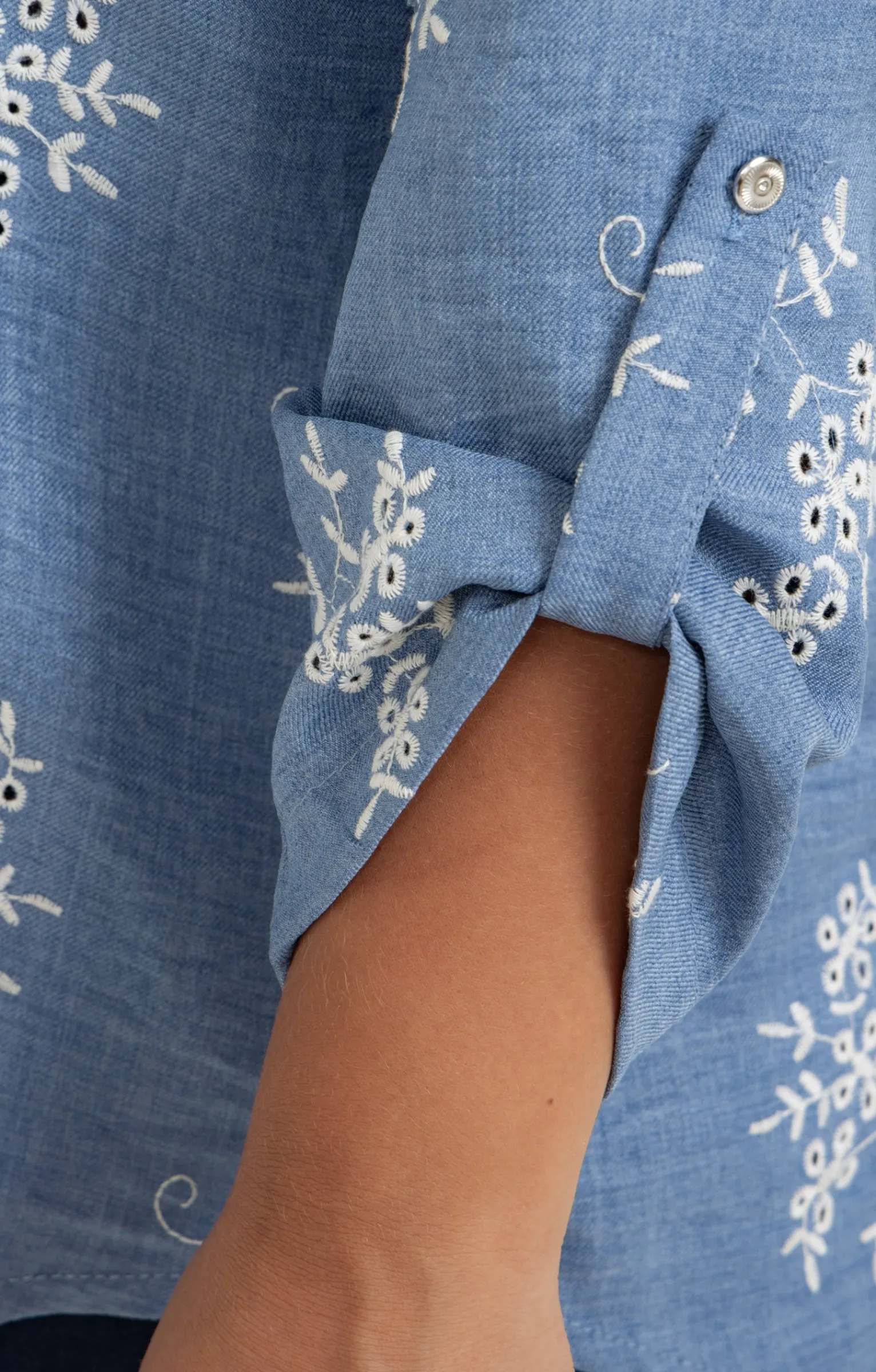 Chemise brodée à fleurs. Coupe droite. Manches 3/4 ajustables par une patte boutonnée. Col V. Fermeture boutonnée sur le devant. Broderie anglaise à motif floral réalisée dans un fil contrastant, sur l’ensemble du modèle. Bicolore. Base plus longue au dos. Bas liquette. Découpe horizontale et pli d’aisance au dos.