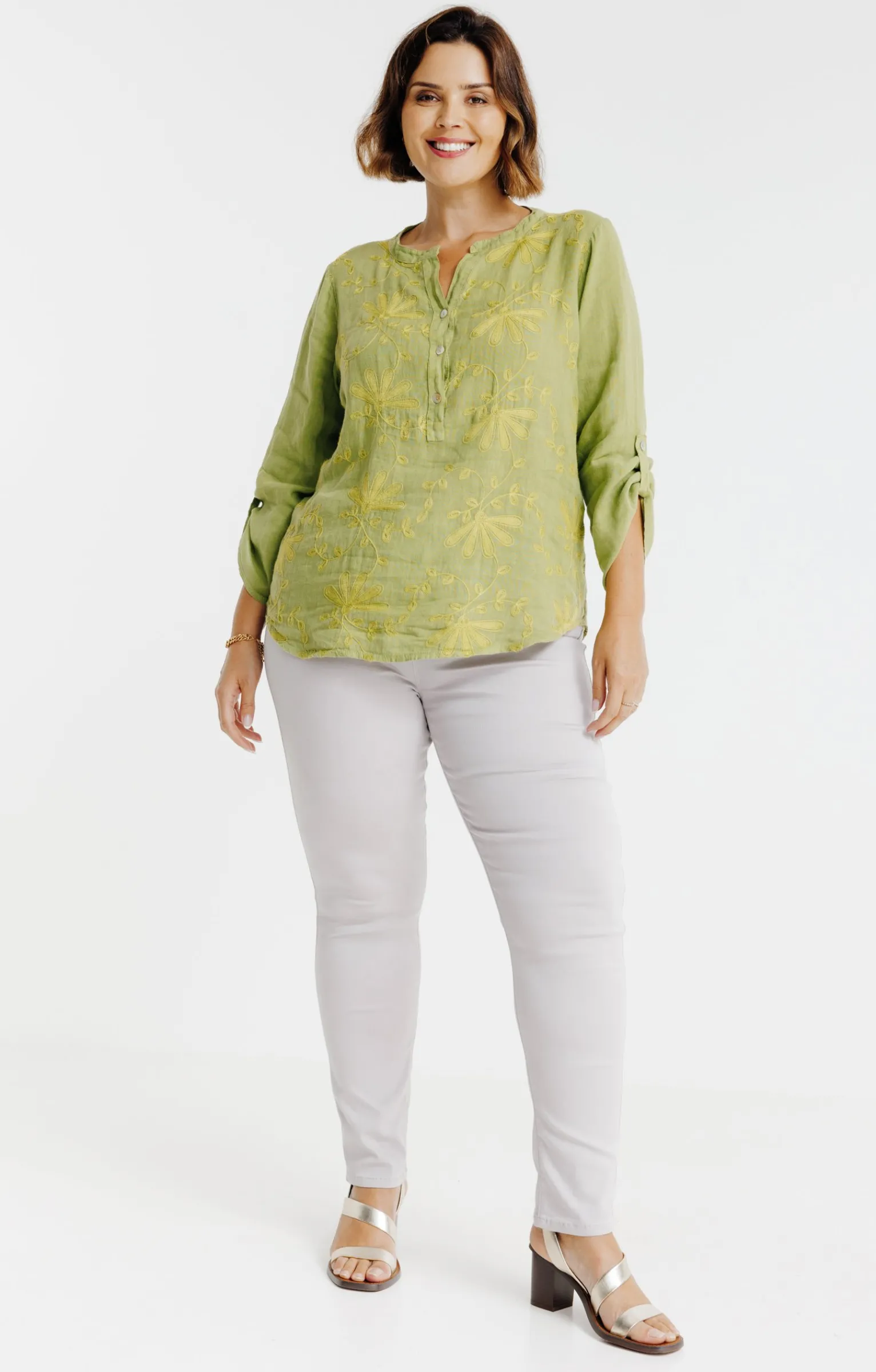 Chemisier droit à manches 3/4 retroussables par patte boutonnée. Col rond fendu avec patte de boutonnage partielle à l’avant. Broderies florales en relief sur le devant. Base arrondie. Coloris uni. Notre mannequin Rafa mesure 1m75 et porte une chemise taille 1.