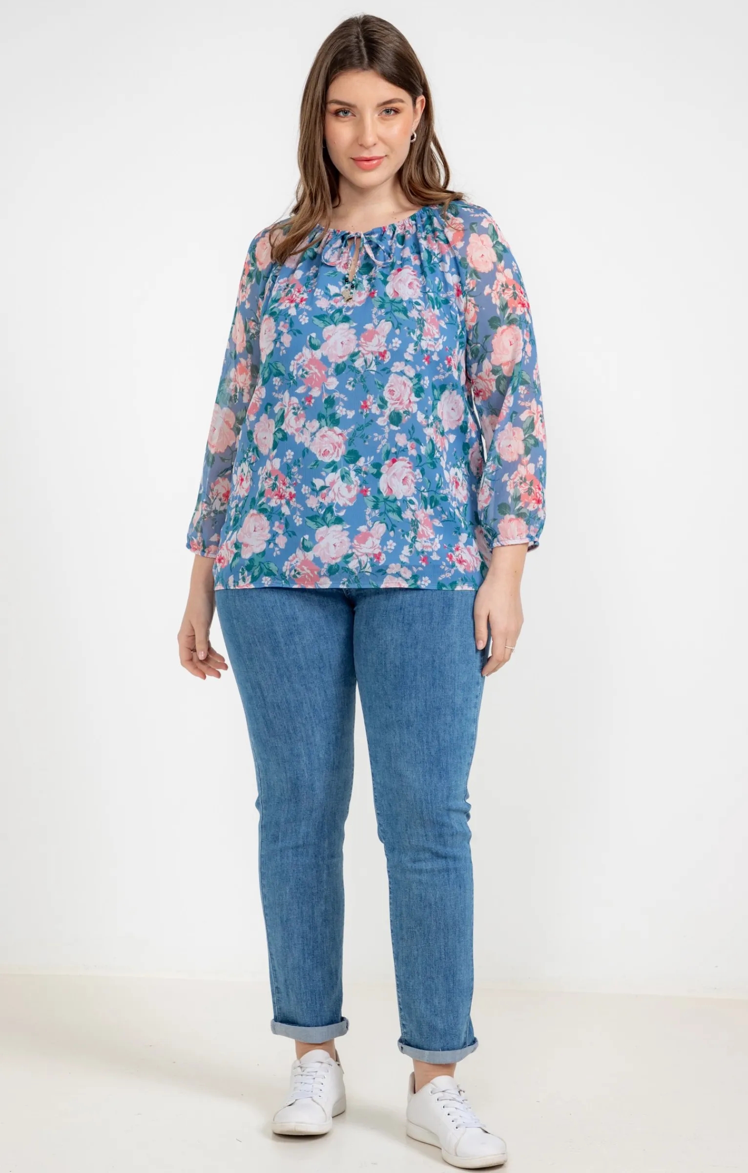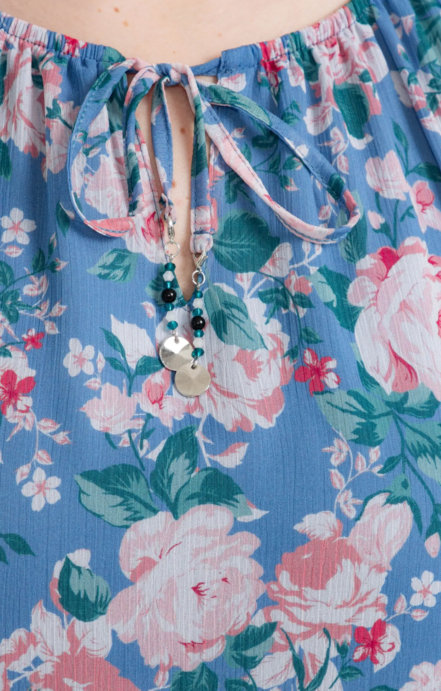 Blouse à fleurs avec liens au col. Coupe droite fluide. Manches 3/4 à emmanchures raglan, avec poignets élastiqués. Col rond avec fente et liens à nouer. Imprimé à motifs roses sur l’ensemble du modèle. Matière texturée. Doublure corps. Perles tricolores et bijoux ronds plats en finition des liens au col, fixés par un mousqueton.