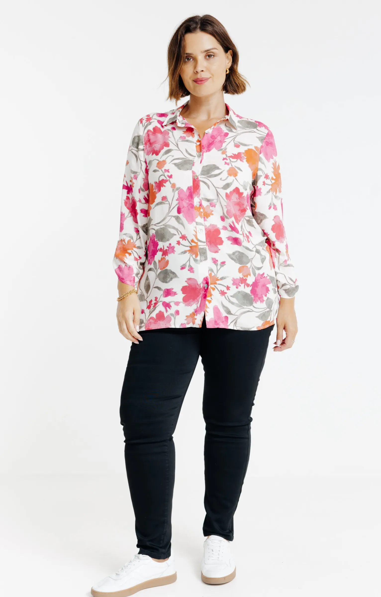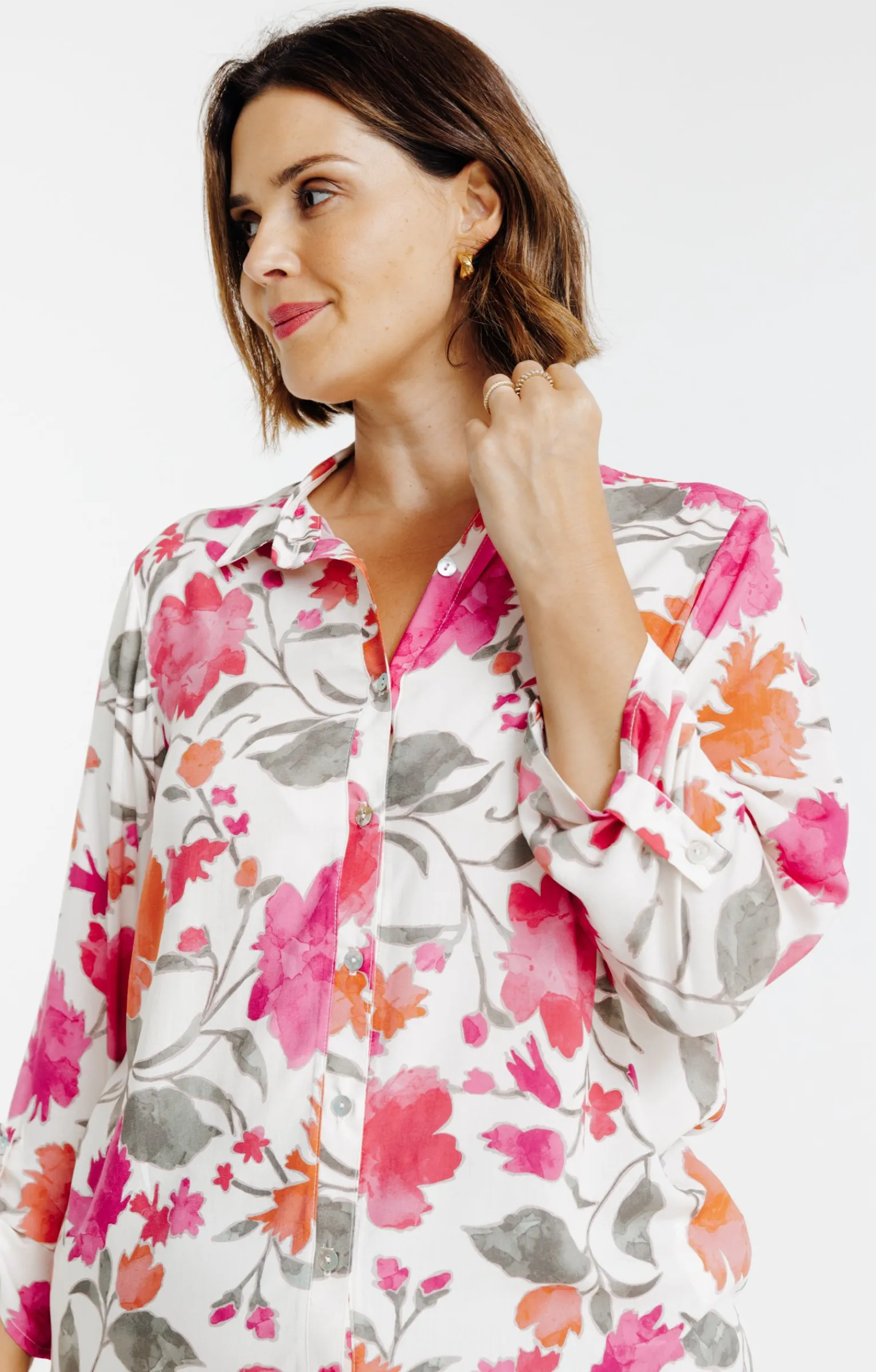 Chemisier imprimé à manches 3/4. Coupe droite. Col chemise classique. Fermeture boutonnée sur toute la longueur devant. Imprimé floral multicolore sur l’ensemble du modèle. Base droite avec fentes latérales discrètes. Poignets boutonnés avec patte de retroussage. Notre mannequin Rafa mesure 1m75 et porte une chemise taille 1.