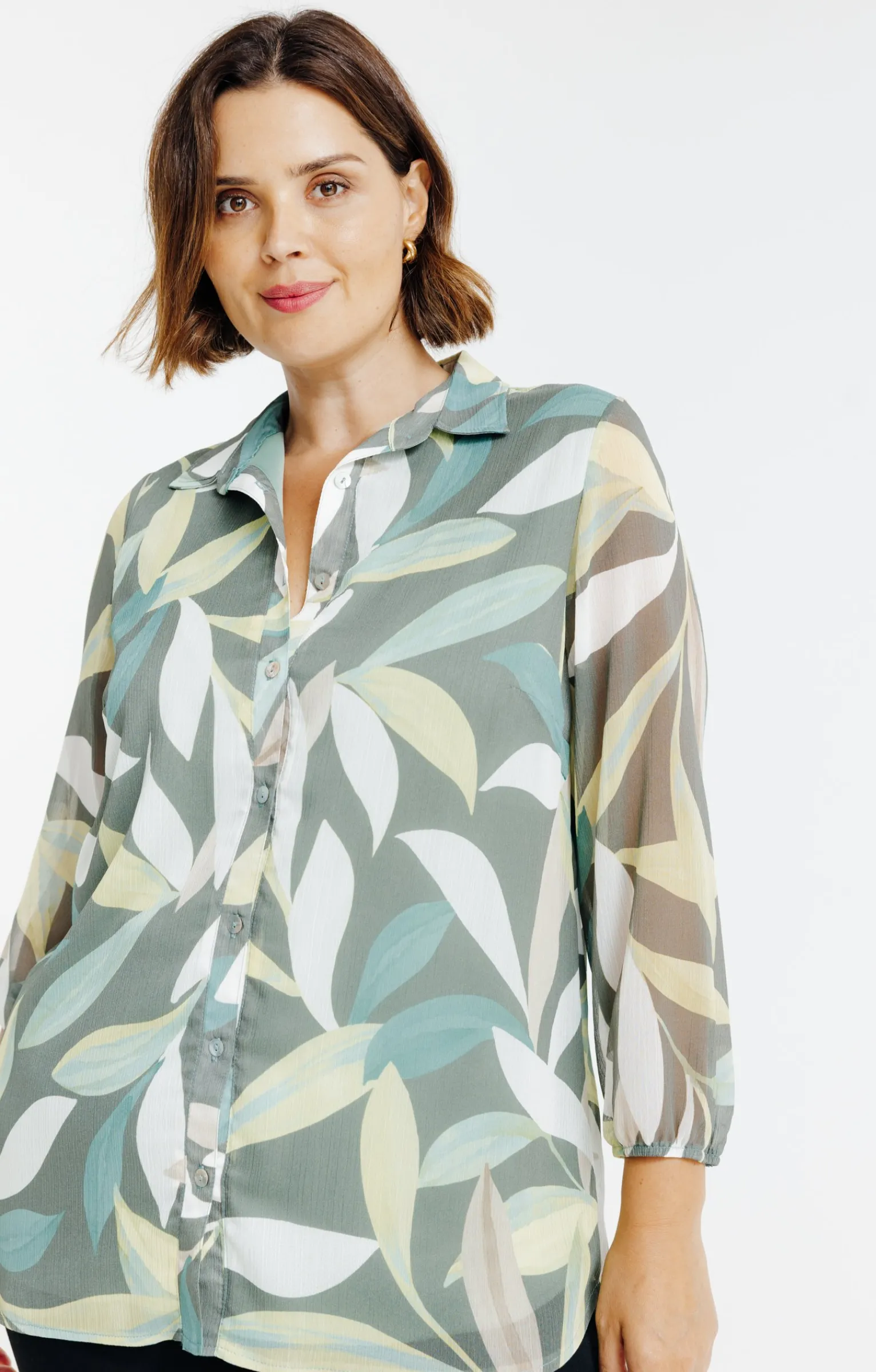 Chemisier imprimé à manches 3/4. Coupe droite. Col chemise classique. Fermeture boutonnée sur le devant avec petits boutons ronds. Motif à feuilles multicolores sur l’ensemble. Tissu légèrement transparent sur les manches à effet strié. Poignets élastiqués. Base droite. Notre mannequin Rafa mesure 1m75 et porte une chemise taille 1.