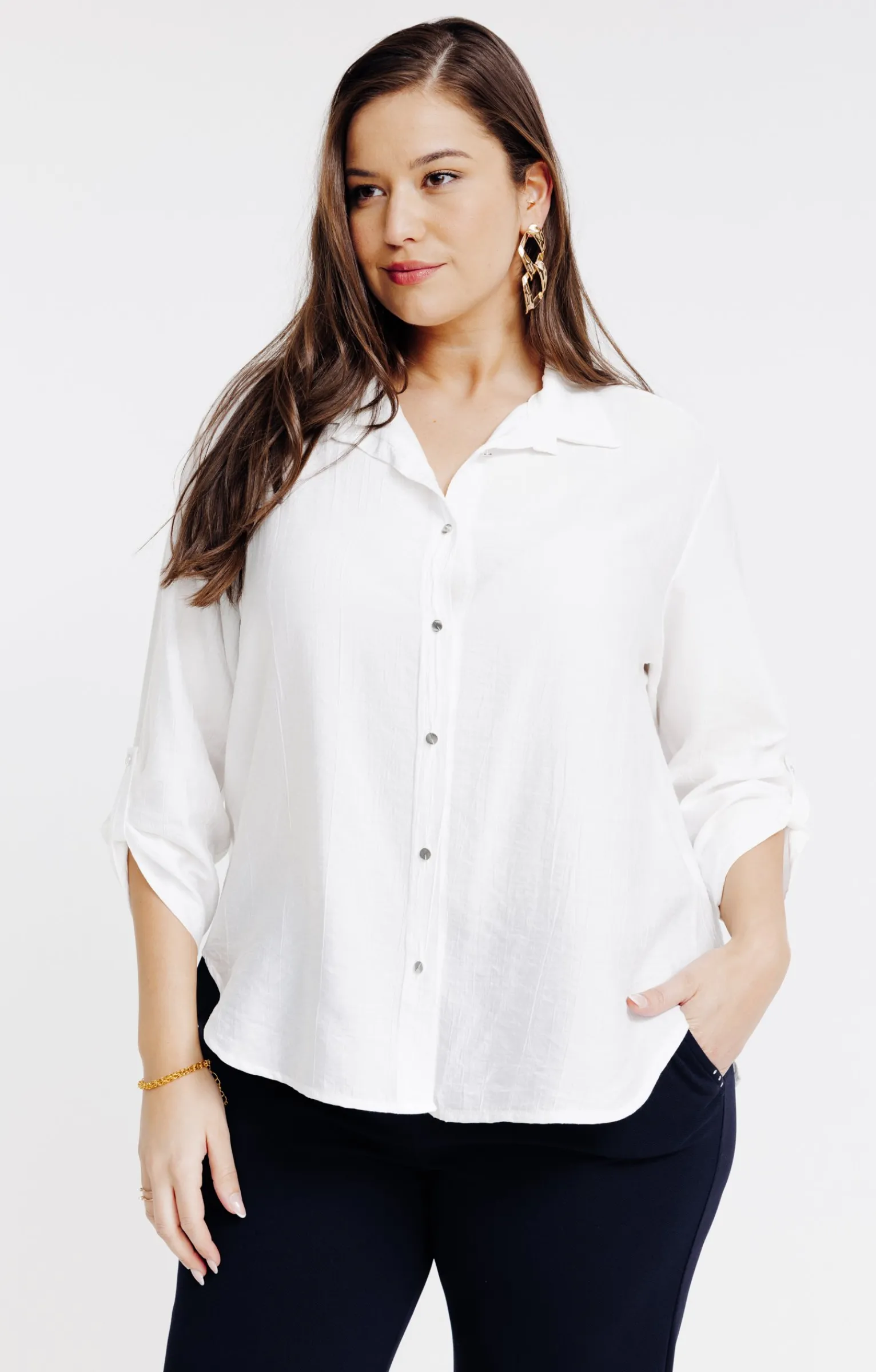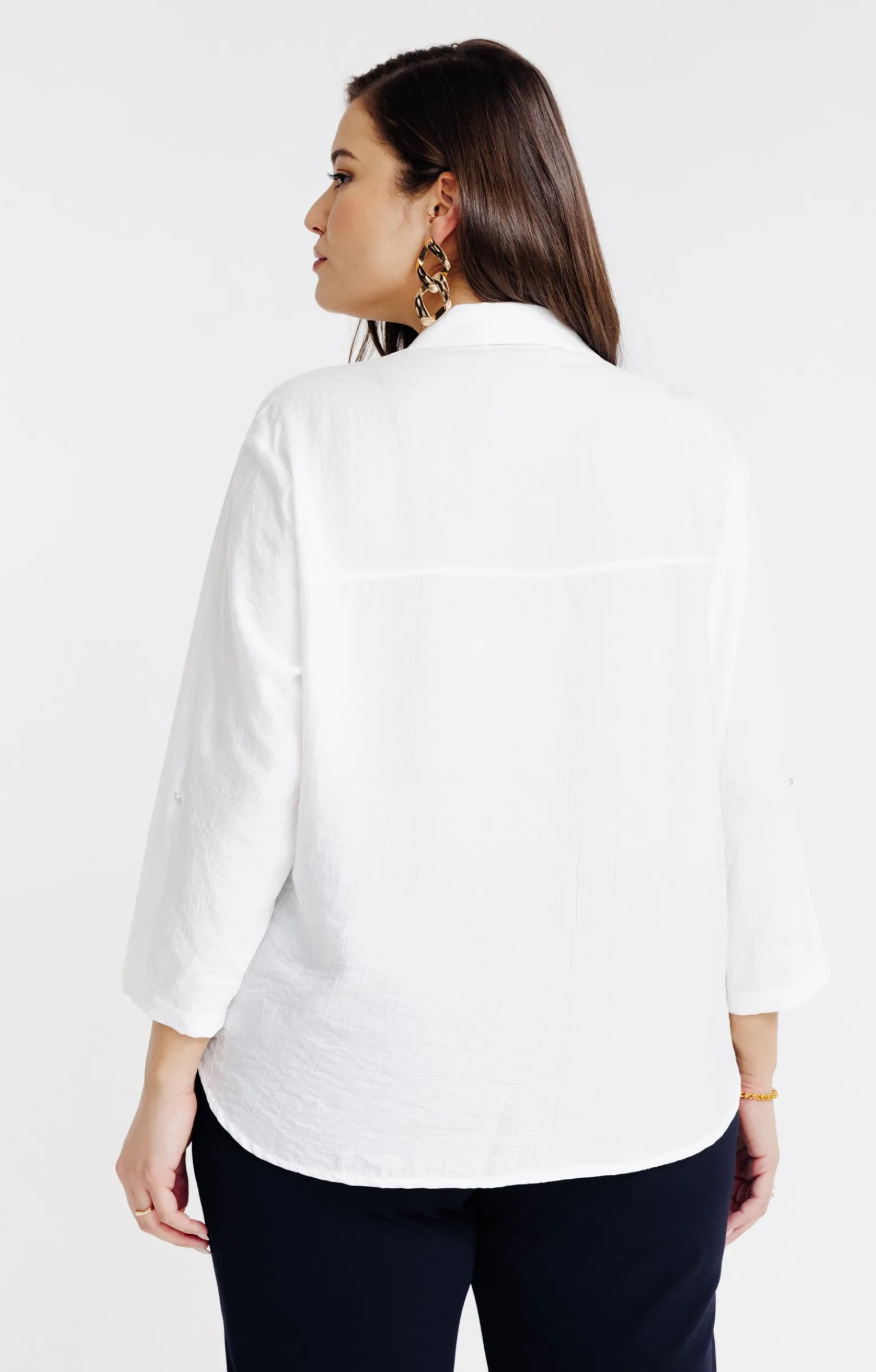 Chemisier uni à manches 3/4. Coupe droite ample. Manches 3/4 à emmanchures basses ajustables par une patte boutonnée. Col chemise classique. Fermeture par de petits boutons sur le devant. Coloris uni. Matière texturée. Découpe horizontale dans le haut du dos. Coutures discrètes en finition.