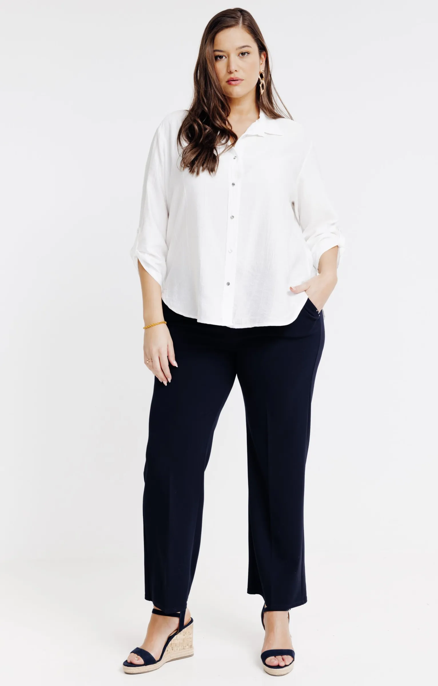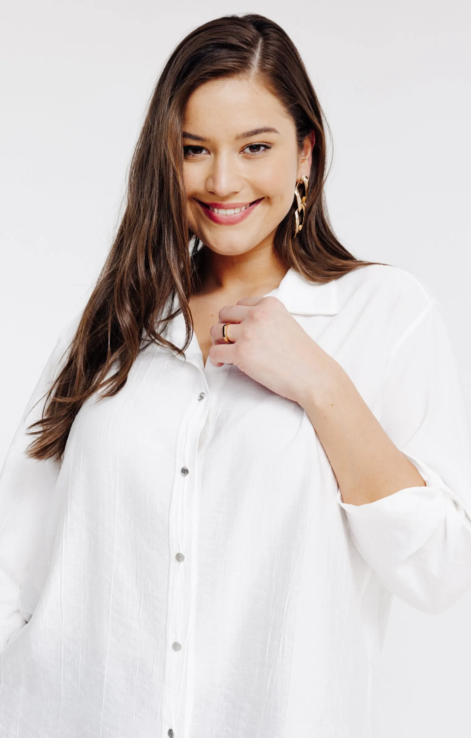 Notre mannequin Bella mesure 1m74 et porte un chemisier taille 1.