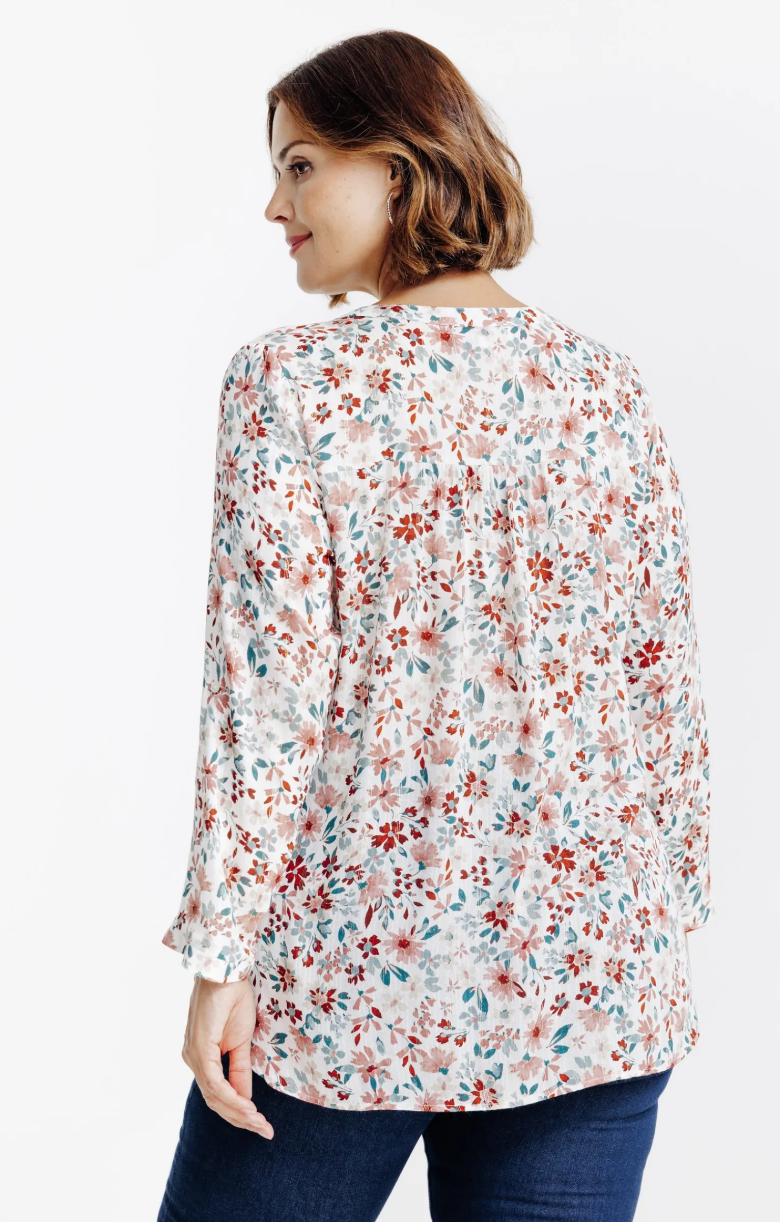 Chemisier imprimé à manches longues. Coupe droite. Col en V avec patte de boutonnage. Motif floral multicolore sur l’ensemble. Tissu à effet strié. Une poche poitrine plaquée. Poignets boutonnés. Base arrondie.