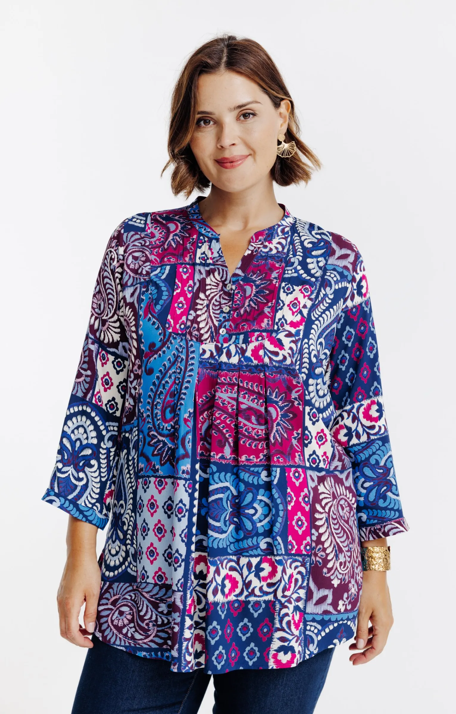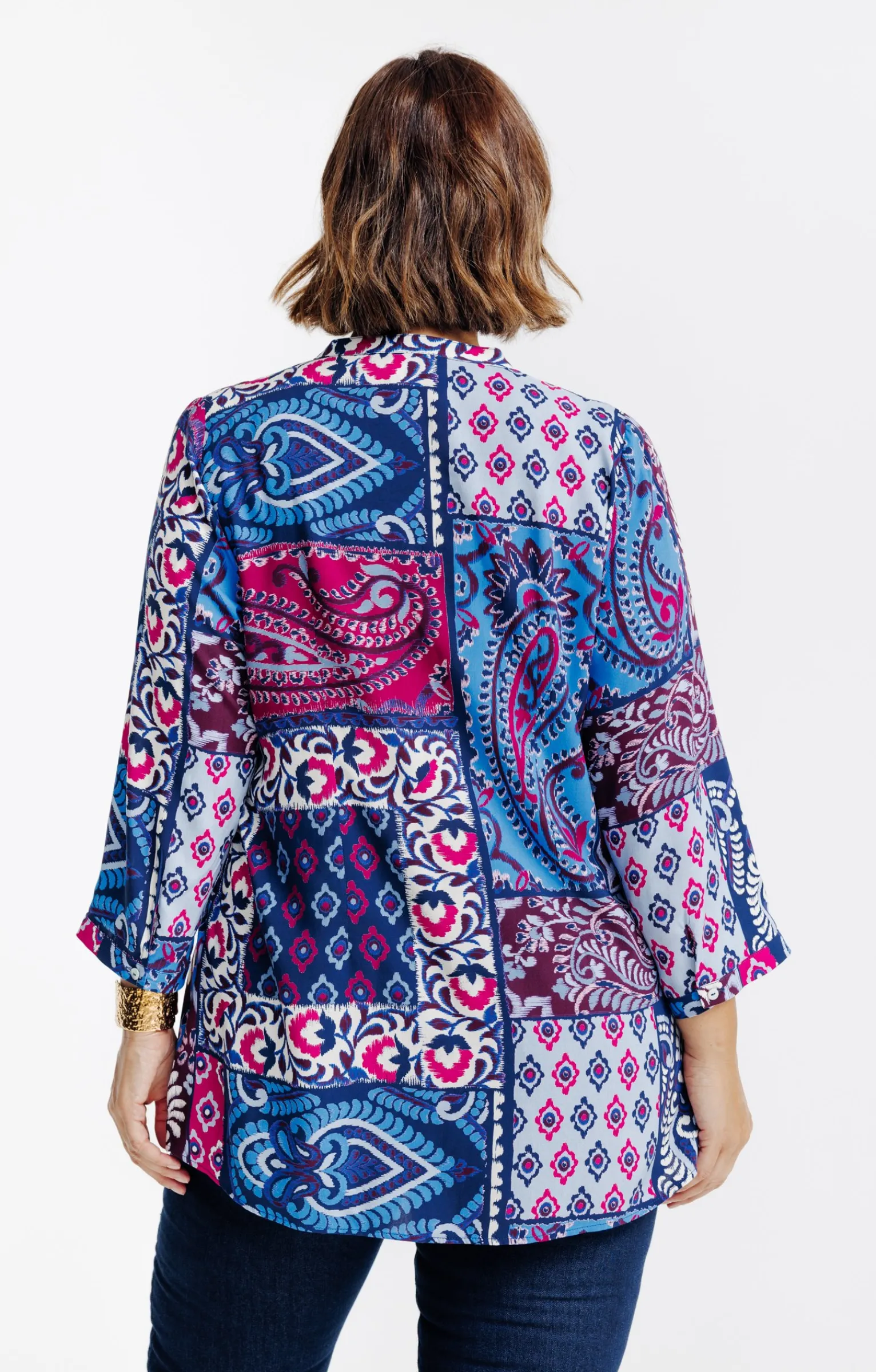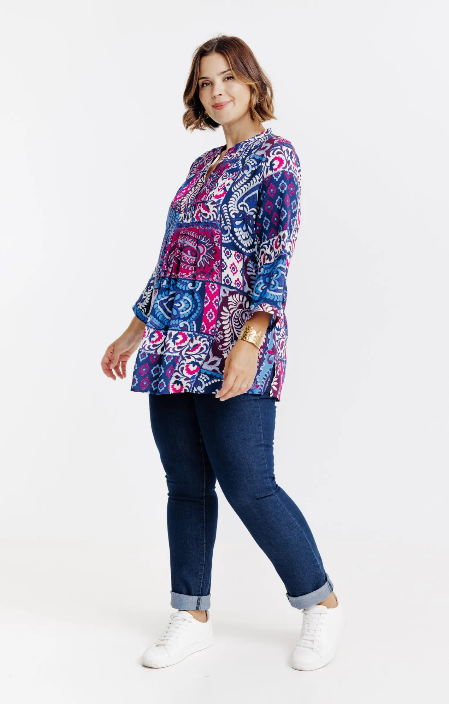 Chemise imprimée à motifs géométriques et végétaux. Coupe droite et ample. Col plastron avec encolure fendue et patte boutonnée. Manches 3/4 droites. Fronces sous la poitrine. Longueur standard. Coloris multicolore.