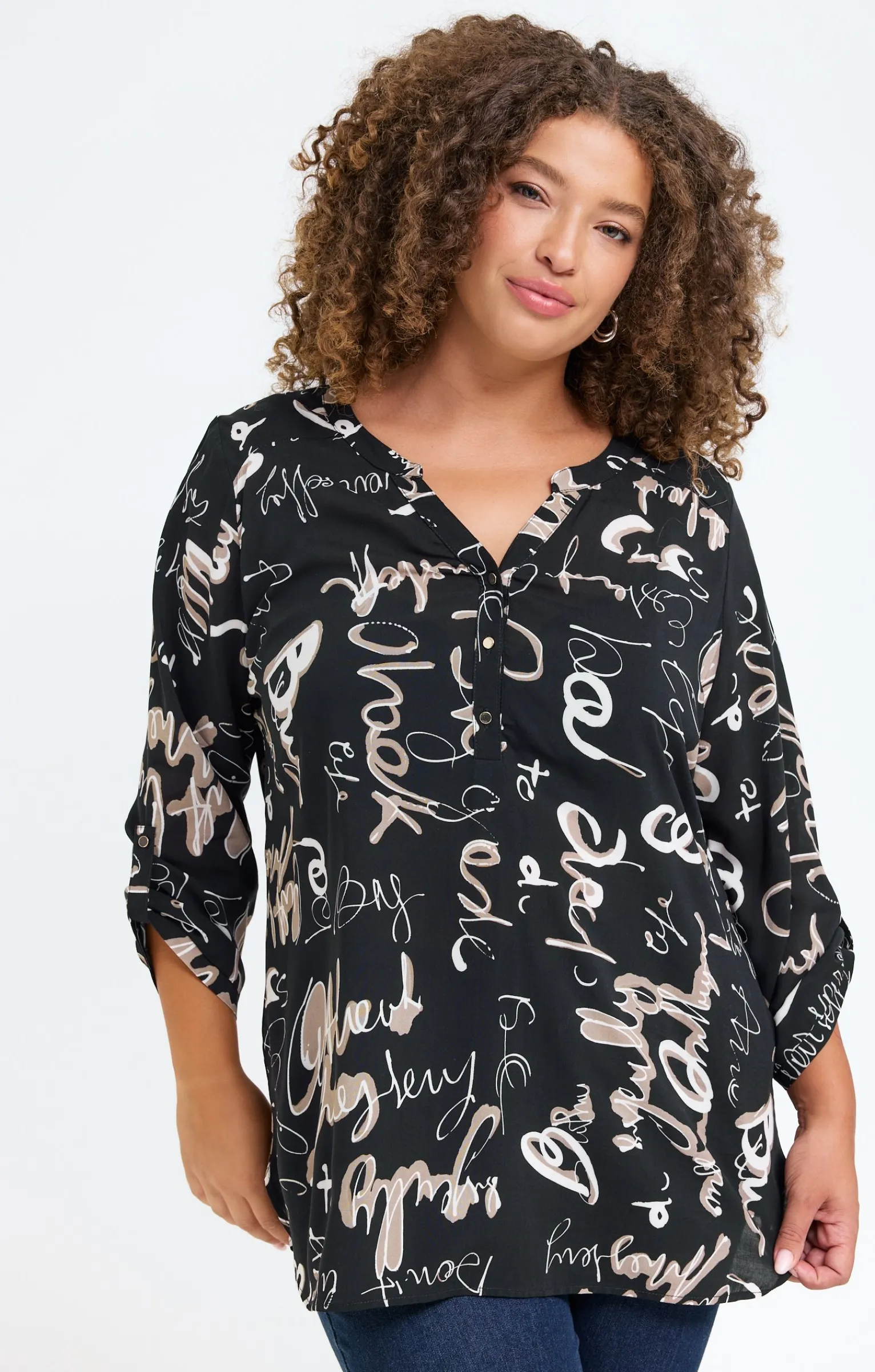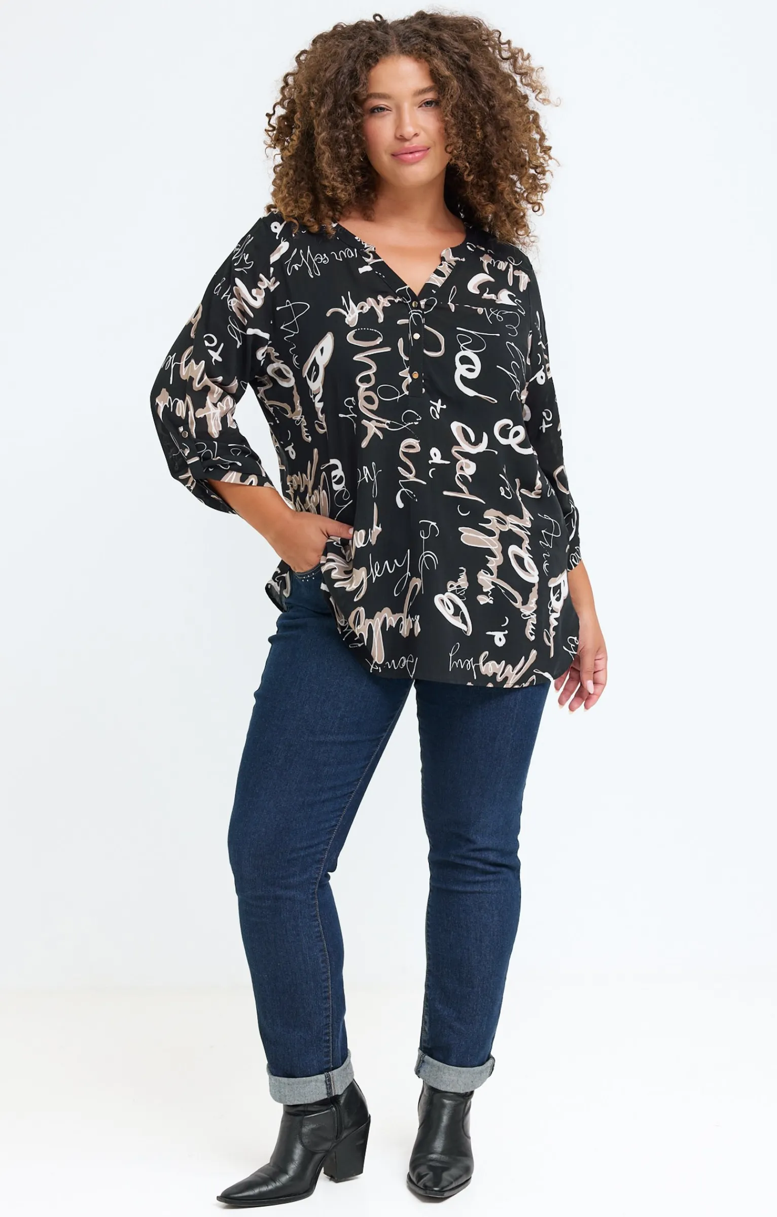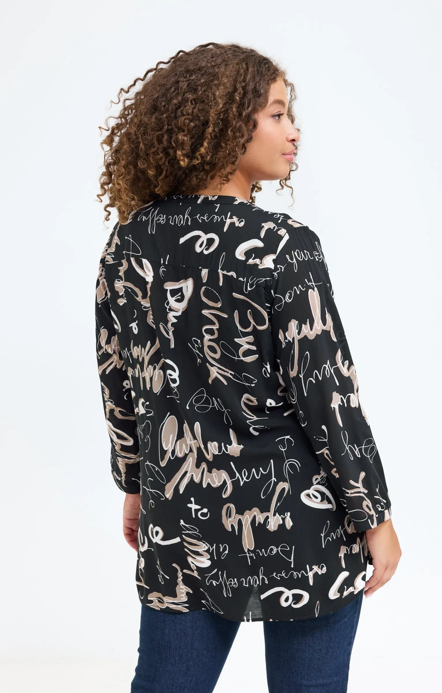 Blouse imprimée avec inscriptions. Coupe droite ample. Longueur sous les fesses. Manches 3/4 ajustables par une patte boutonnée. Col tunisien fermé par des boutons. Imprimé à motifs inscriptions sur fond uni sur l’ensemble du modèle. Découpe horizontale dans le haut du dos. Composition 100 % viscose ECOVERO™.