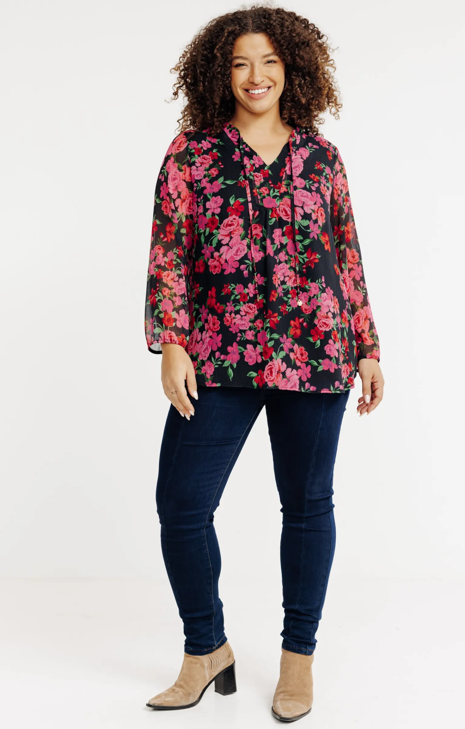 Tunique en voile imprimé floral à manches longues et col V à nouettes bijoux. Coupe droite. Manches longues avec poignets resserrés. Col V avec nouettes bijoux à pendentifs médaillon et détails perles. Bijoux amovibles par attache mousqueton. Imprimé floral. Tissu en voile plissé. Doublure corps. Fines surpiqûres discrètes en finition du modèle. Base arrondie.