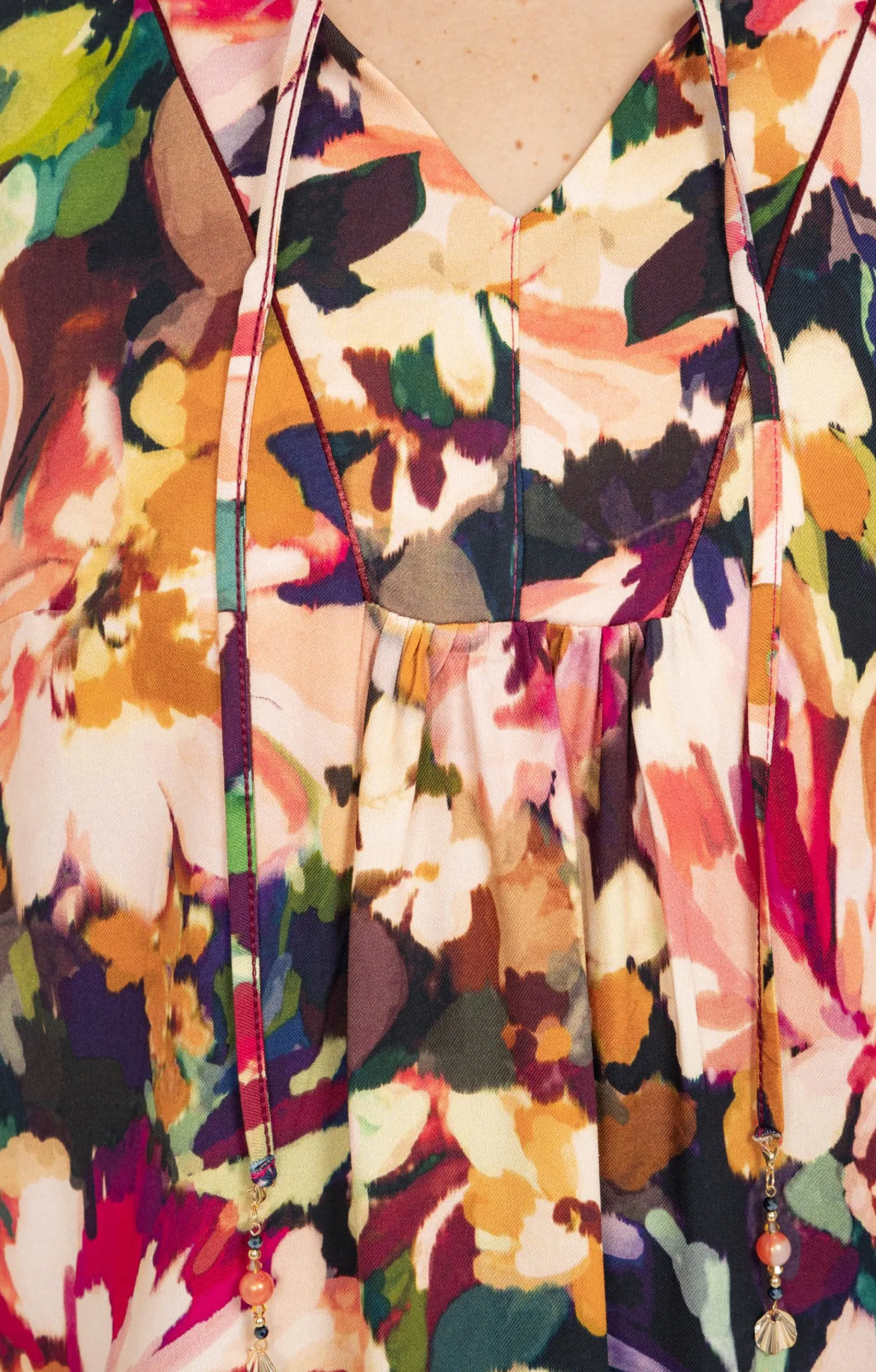 Tunique imprimé floral à manches 3/4 et col V. Coupe droite. Manches 3/4 avec bas des manches élastiqués. Col V avec nouettes. Liens à embouts bijoux amovibles par attache mousqueton. Imprimé floral. Motifs effet aquarelle sur toute la surface du modèle. Tissu léger au tombé fluide. Empiècement façon plastron avec bordures passepoilées et base à fines fronces au niveau de l’encolure. Base arrondie.