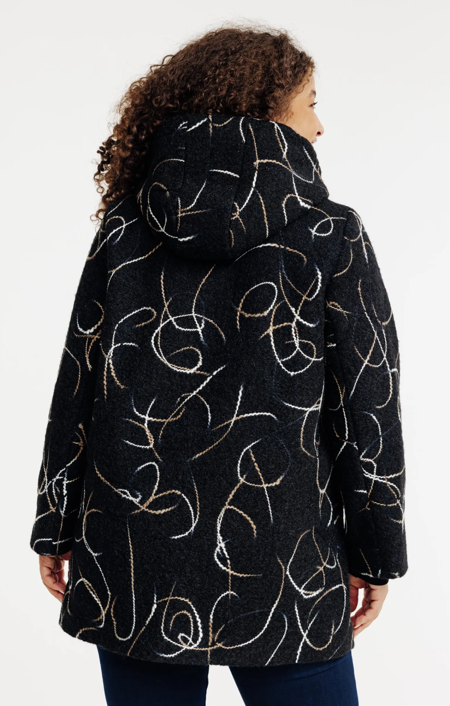 Misez sur l’originalité avec ce manteau imprimé. Manteau à capuche imprimé. Coupe droite. Manches longues à emmanchures droites. Col montant avec capuche. Fermeture boutonnée sur le devant. 2 poches en biais sur le devant. Imprimé fantaisie à motifs façon cordes. Modèle doublé.