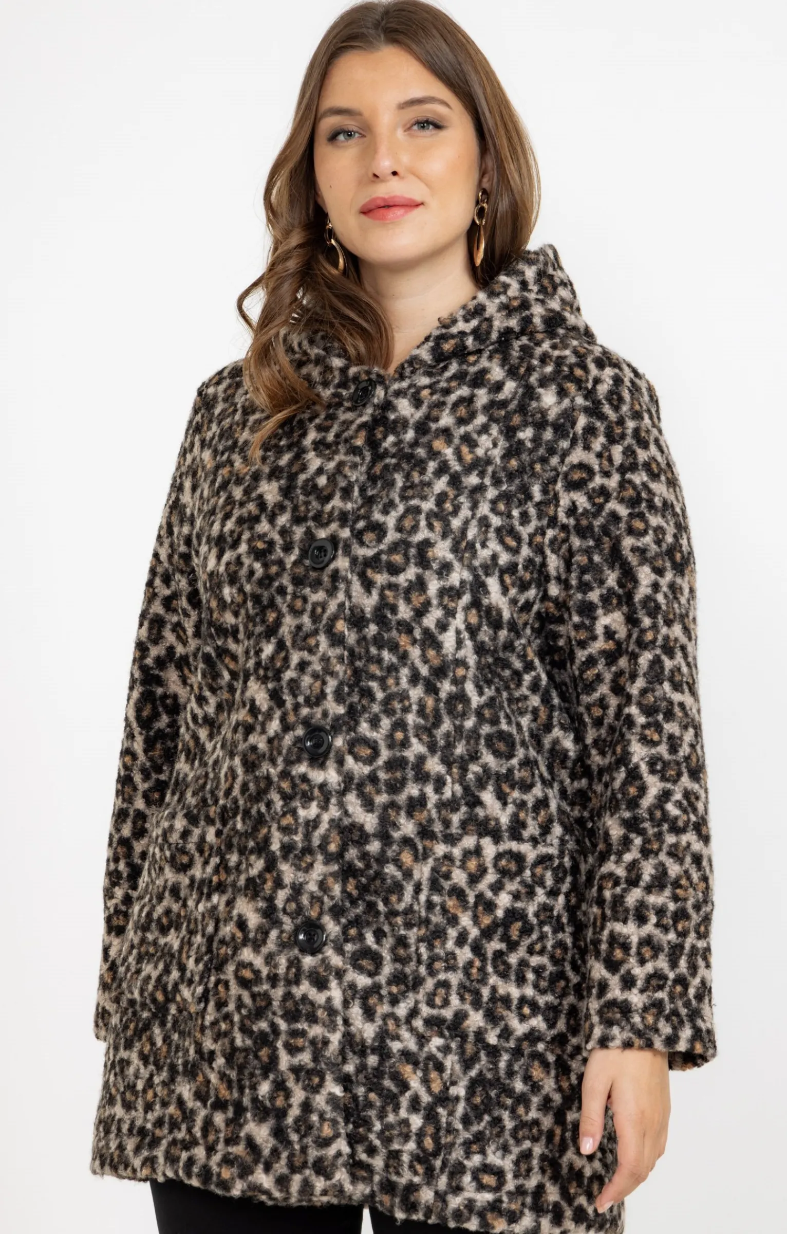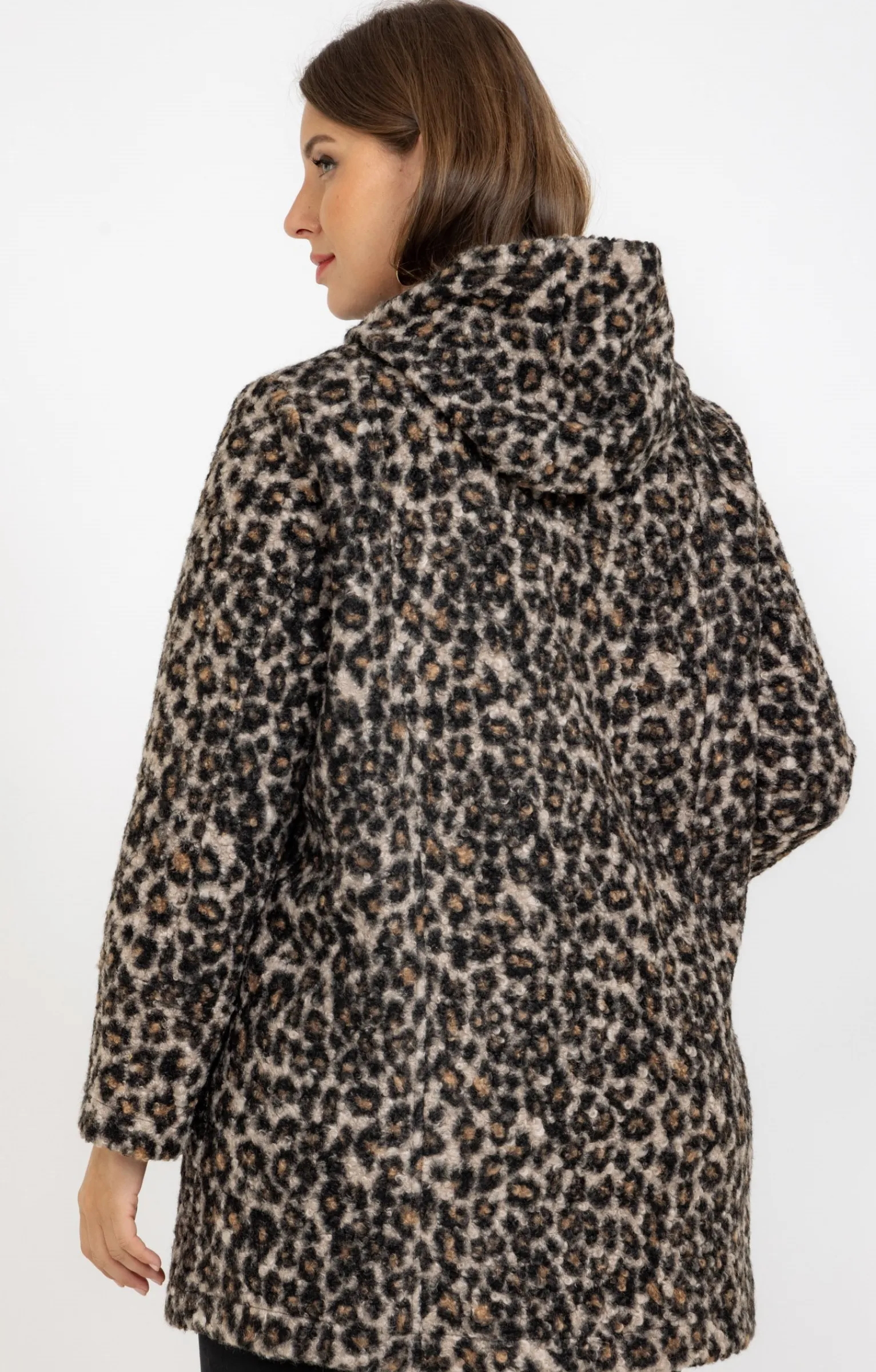Alliez confort et modernité avec ce manteau imprimé. Manteau à capuche imprimé animalier. Coupe droite. Manches longues. Emmanchures droites. Col avec capuche. Fermeture boutonnée sur le devant. 2 poches plaquées sur le devant. Imprimé à motifs animaliers. Matière douce et chaude imitation fourrure.