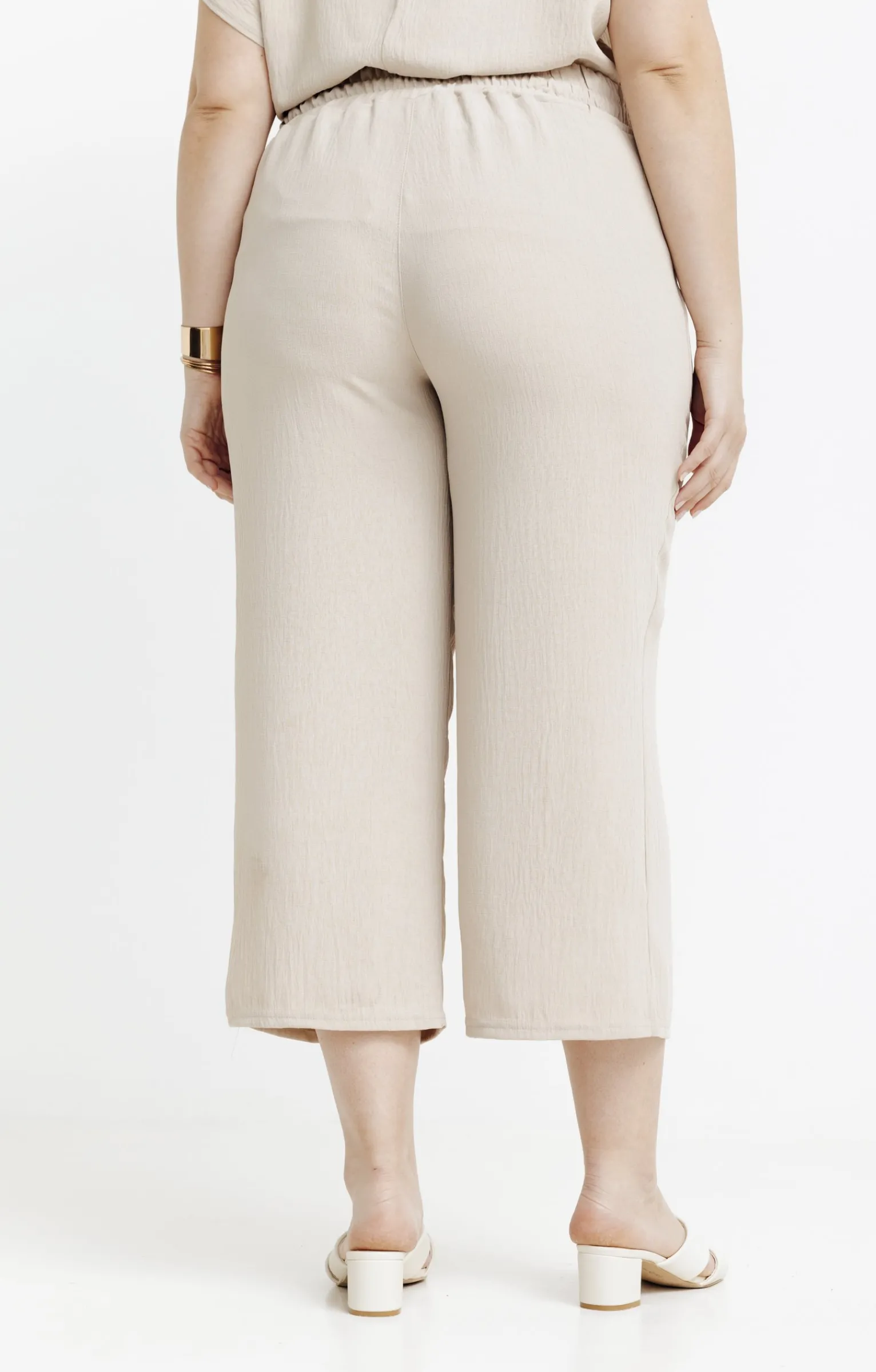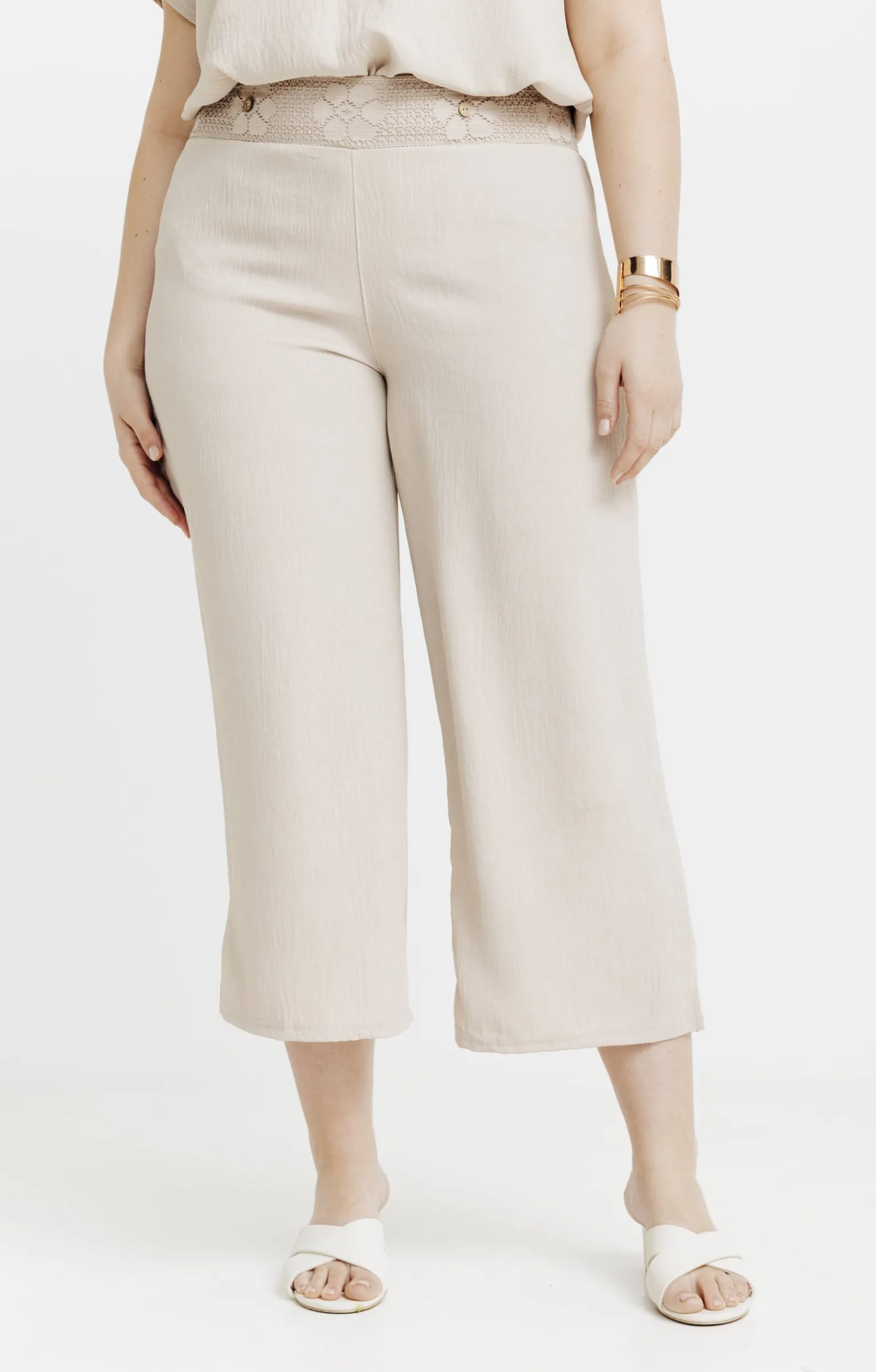 Pantacourt large à taille élastiquée. Coupe droite avec jambes larges. Longueur mi-mollets. Coloris uni. Matière fine et légère au tombé fluide. Large taille en macramé devant et élastiquée au dos pour un confort optimal. 2 fleurs fantaisie cousues sur la taille devant, avec bouton coco au centre. Fentes en bas de jambes. Coutures ton sur ton.