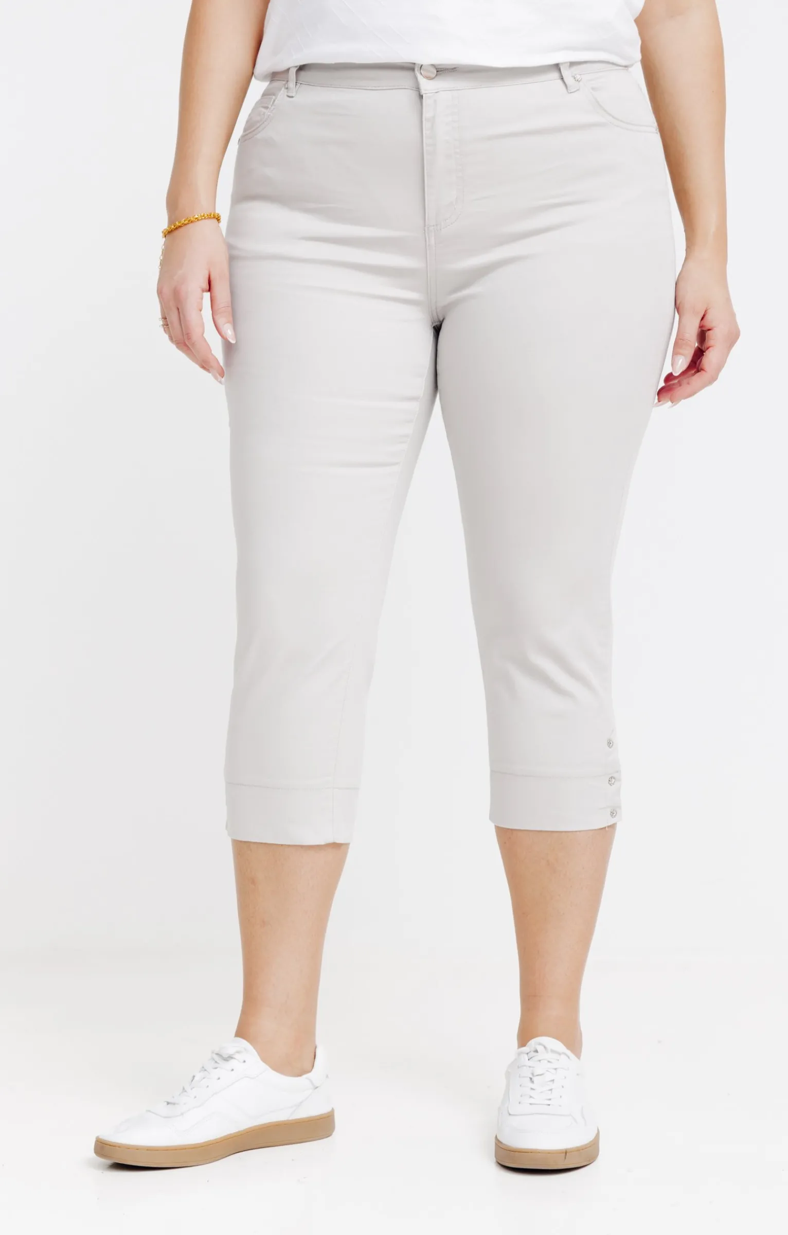 Pantacourt super strech avec boutons fleurs. Coupe ajustée. Longueur mi-mollets. Fermeture par un zip et un bouton sur le devant. 2 poches cavalières et une poche ticket devant. 2 poches plaquées au dos. Coloris uni. Matière très extensible. Passants pour ceinture. Boutons métalliques en forme de fleur au niveau des poches cavalières et en bas de jambes. Coutures ton sur ton. Composition en coton majoritaire.