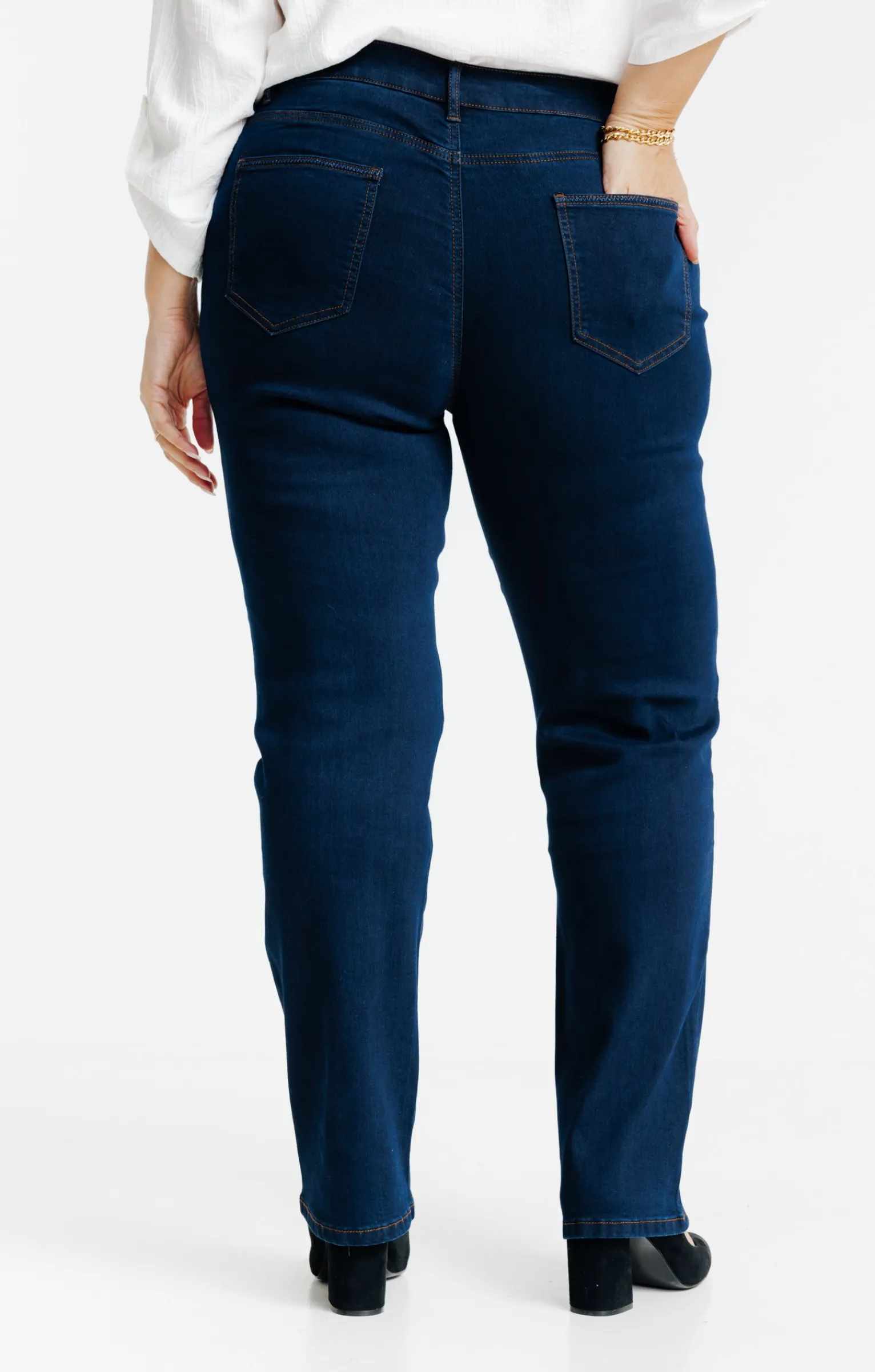 Jean uni coupe droite. Longueur longue. Fermeture par zip sous patte et bouton métallique. 2 poches cavalières devant et 2 poches plaquées au dos. Passants pour ceinture. Surpiqûres contrastantes. Matière extensible. Notre mannequin Rafa mesure 1m75 et porte un pantalon taille 1.