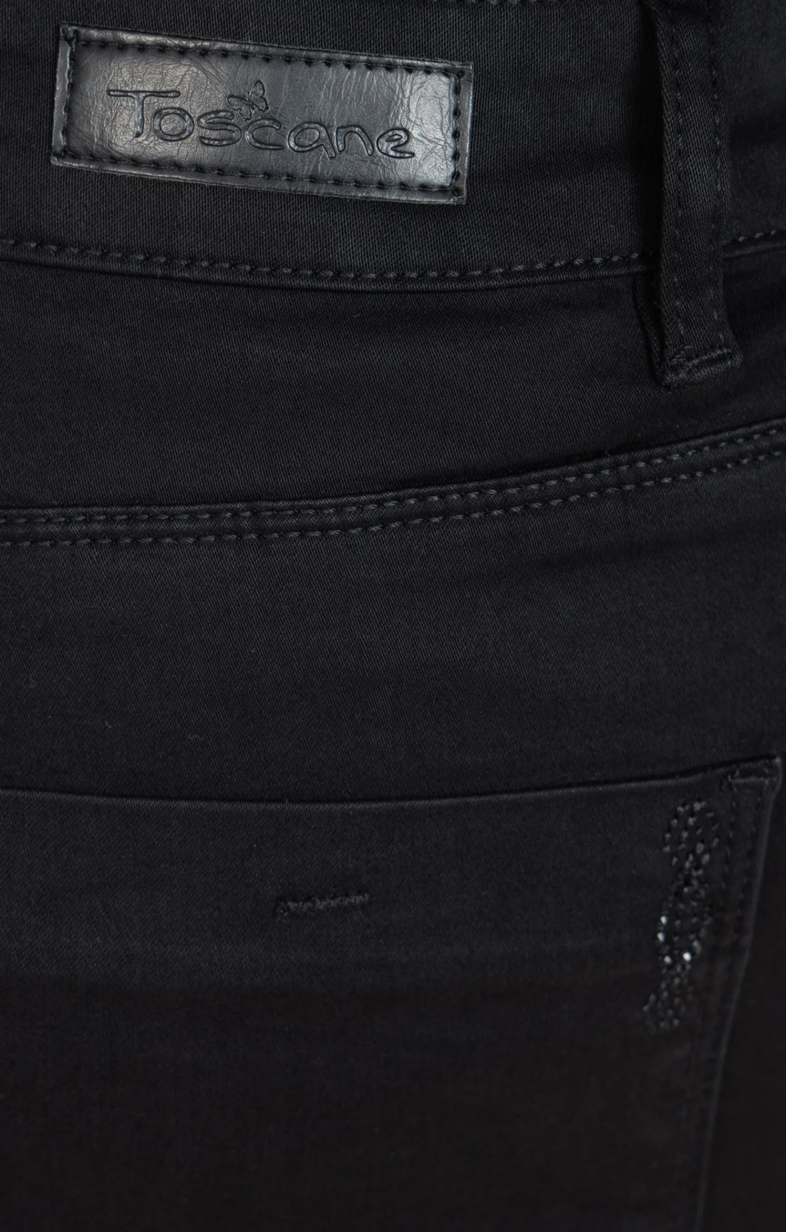 Pantalon droit avec détails strass. Coupe droite. Fermeture zippée et boutonnée sur le devant. 2 poches cavalières et une poche ticket sur le devant. 2 poches plaquées au dos. Coloris uni. Matière extensible. Motifs esprit poissons en strass sur le bord des poches devant et dos. Passants pour ceinture. Étiquette sur la ceinture au dos. Coutures ton sur ton.