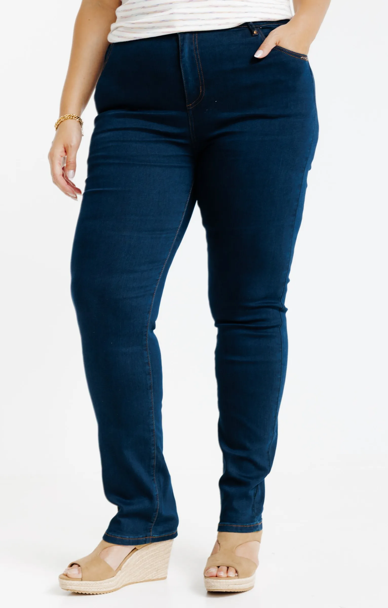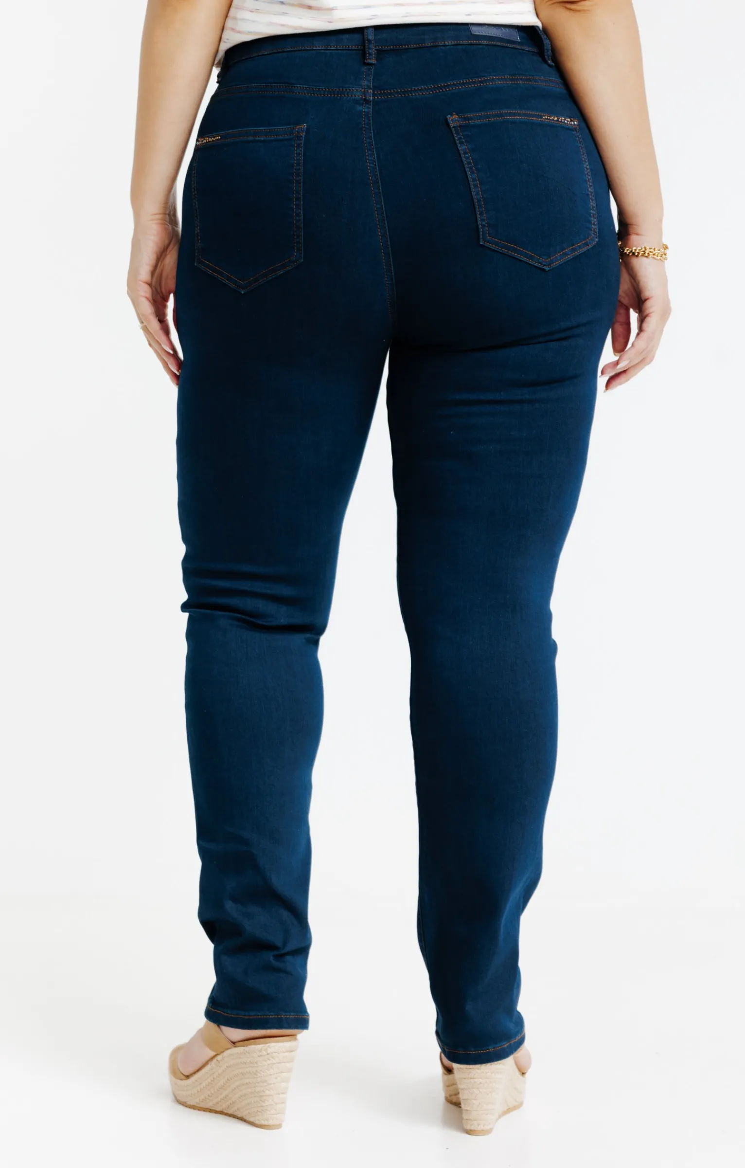 Jean long uni à coupe ajustée. Fermeture par zip recouvert et bouton. 2 poches cavalières devant et 2 poches plaquées au dos. Passants pour ceinture. Surpiqûres contrastantes. Matière extensible. Notre mannequin Rafa mesure 1m75 et porte un jean taille 1.