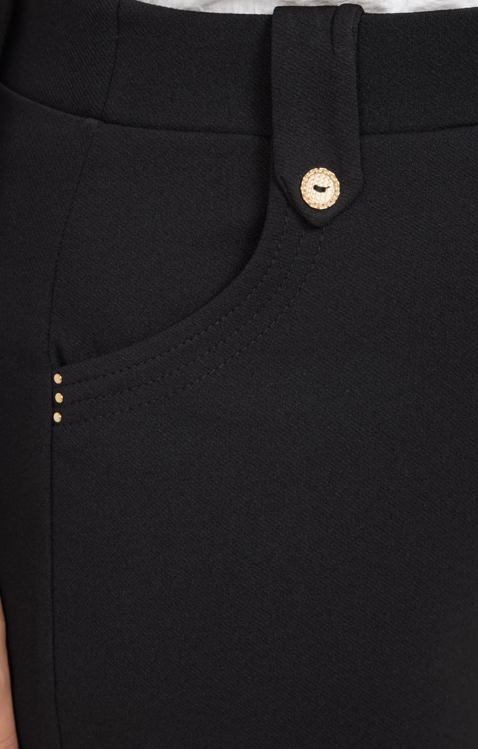 Pantalon large uni. Coupe droite avec jambes larges. 2 poches italiennes sur le devant. Coloris uni. Matière extensible. Taille plate élastiquée pour allier confort et élégance. Passants pour ceinture. Bouton décoratif doré aux contours festonnés sur les passants devant. Studs et coutures décoratifs le long des poches. Coutures ton sur ton.