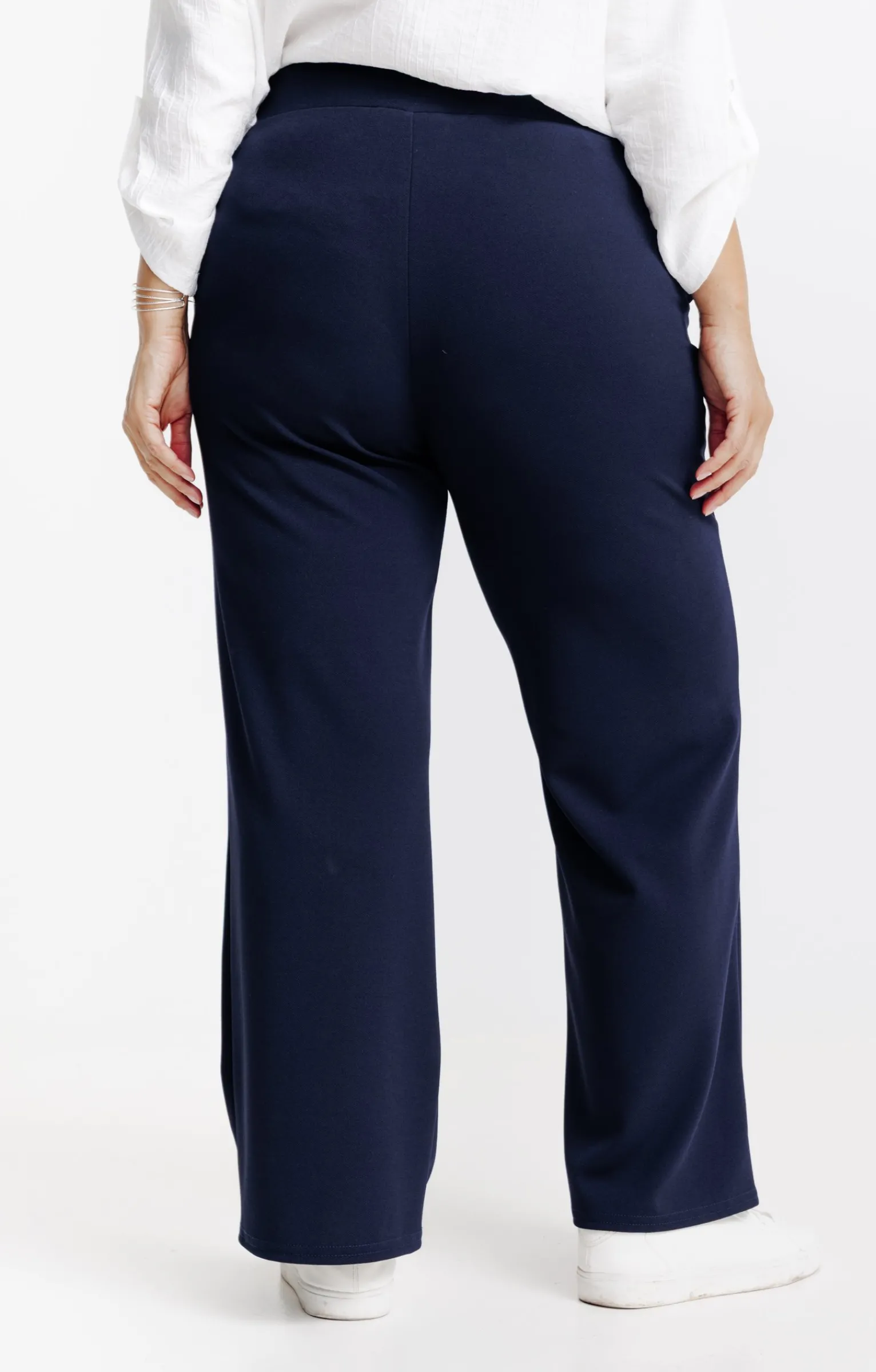 Pantalon uni à jambe large et taille haute. Coupe droite longue. 2 poches italiennes devant. Ceinture plate avec deux boutons décoratifs à la taille. Matière extensible à texture lisse.