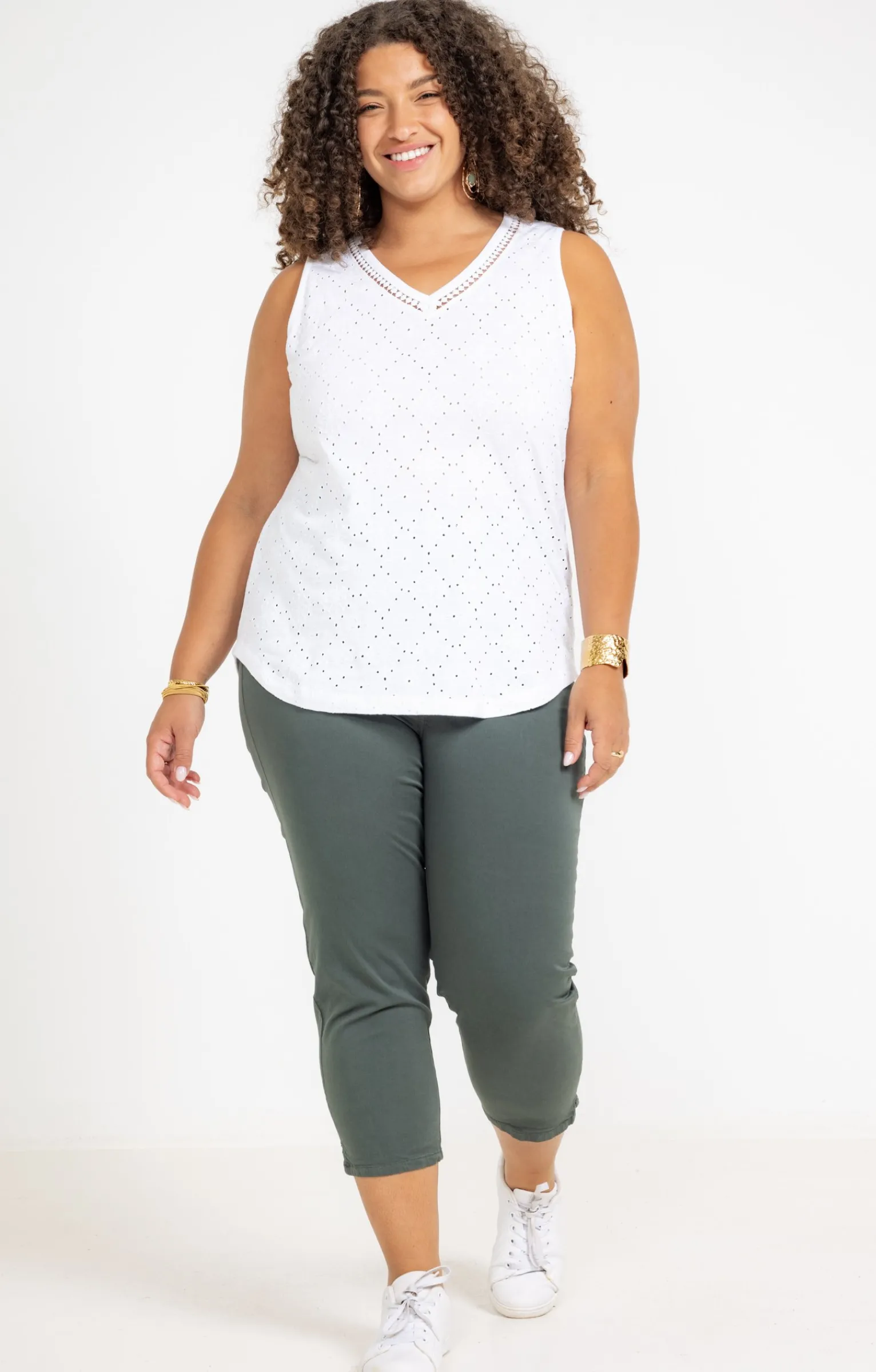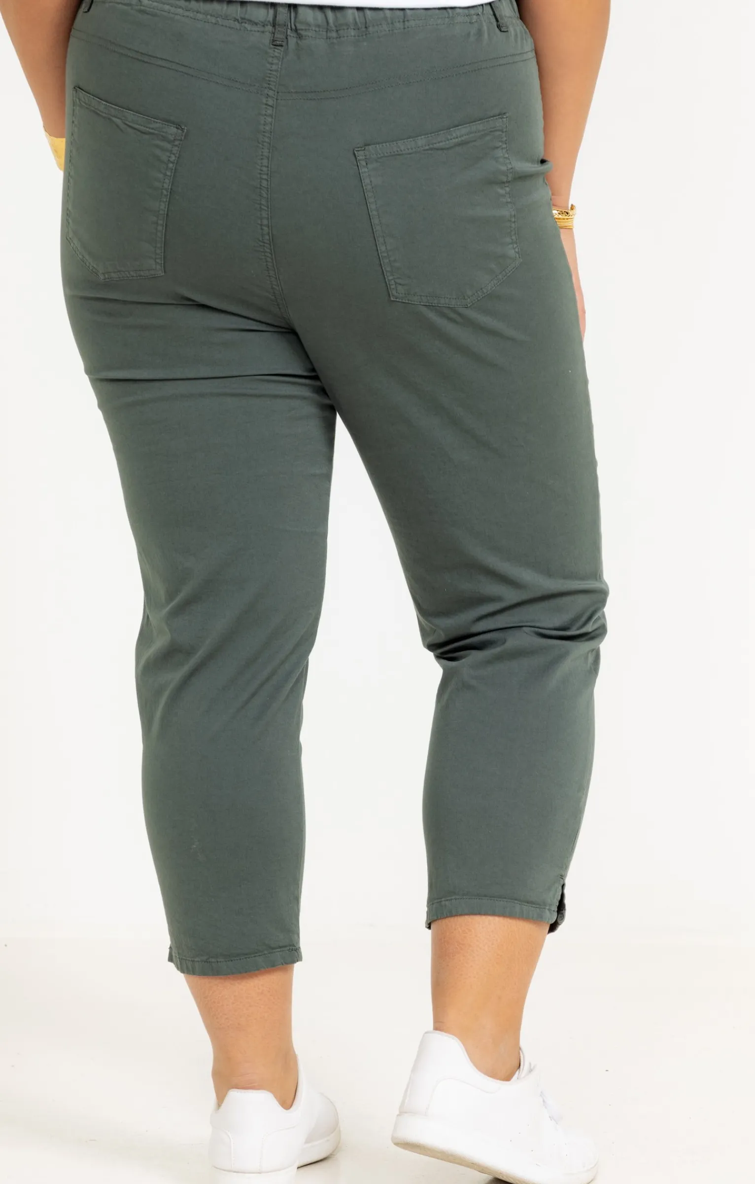 Tregging 7/8 uni avec détails rivets. Coupe slim. Longueur 7/8. Faux zip avec ceinture élastiquée à fines fronces. 2 fausses poches cavalières devant. 2 poches plaquées au dos. Coloris uni. Tissu façon toile léger et souple. Matière extensible. Rivets sur les poches devant. Surpiqûres ton sur ton. Petite fente sur le bas des jambes. Passants pour ceinture.