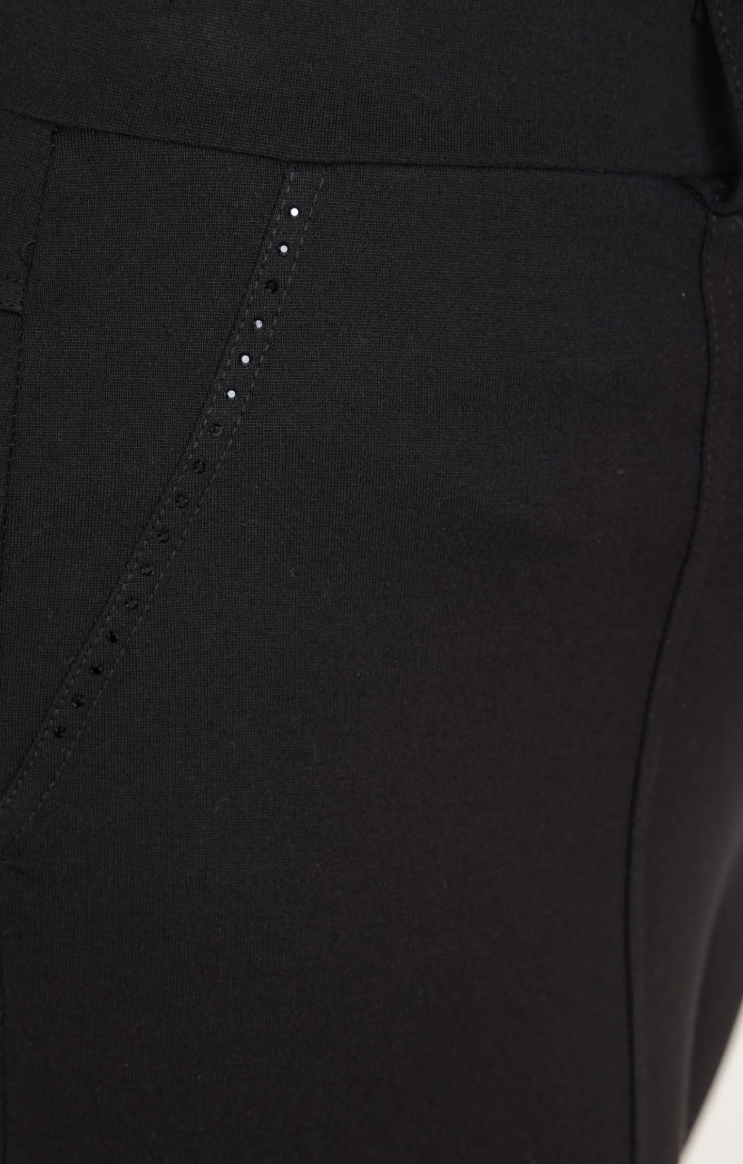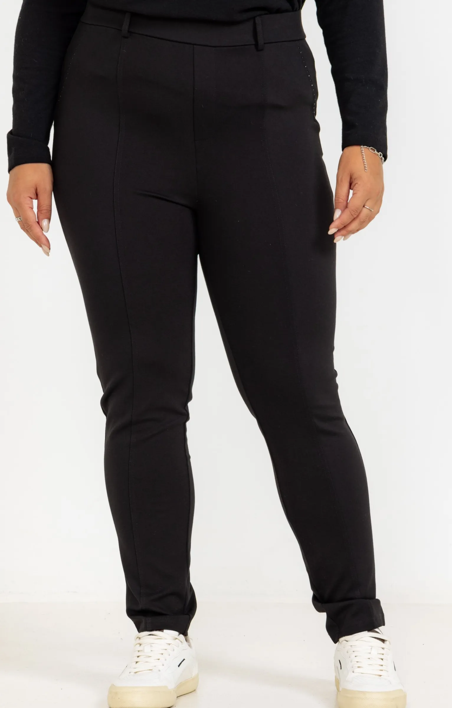 Tregging uni avec strass discrets. Coupe ajustée. Fausse fermeture zippée avec large ceinture élastiquée. 2 fausses poches italiennes devant. 2 poches plaquées au dos. Coloris uni. Tissu extensible à texture lisse. Strass ton sur ton sur les poches devant. Plis surpiqués le long des jambes. Passants pour ceinture. Surpiqûres ton sur ton en finition du modèle.