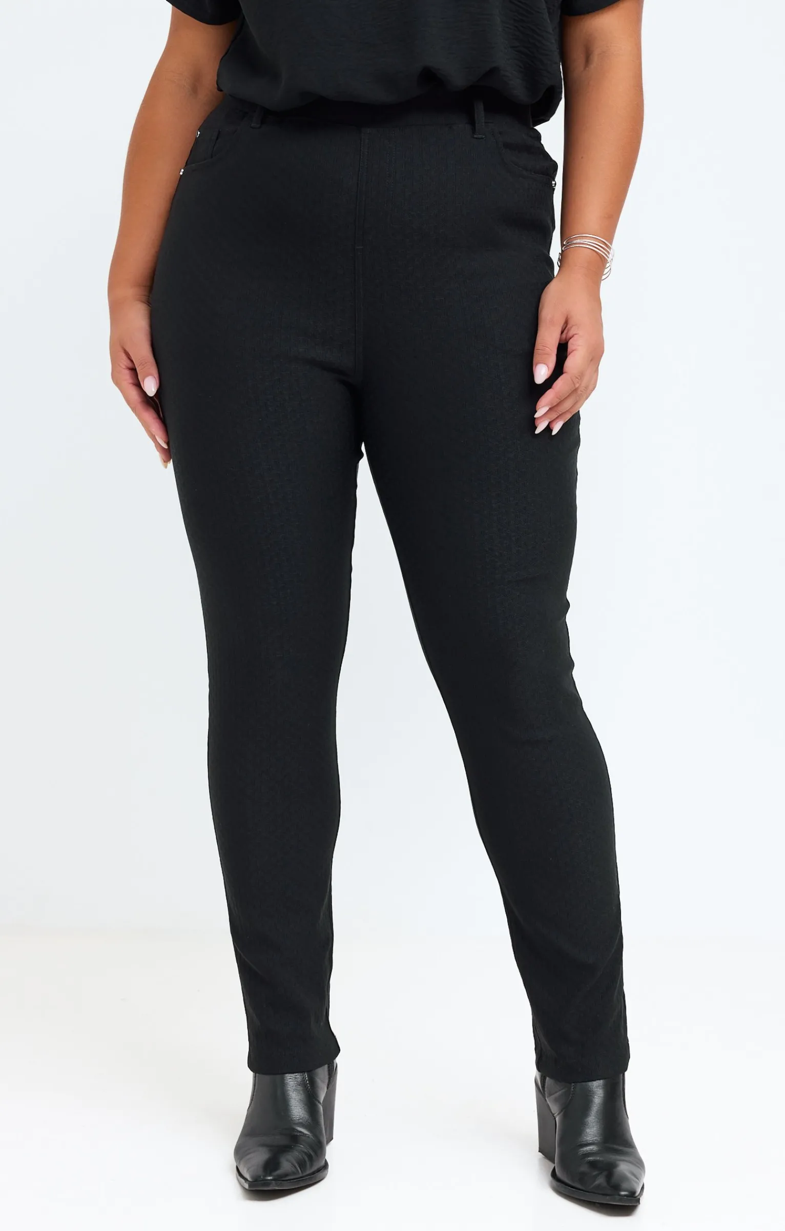 Tregging en maille texturée unie. Coupe slim. Longueur longue. Fausse fermeture zippée sous bord avec large ceinture élastiquée. 2 fausses poches cavalières et une poche ticket devant. 2 poches plaquées au dos. Coloris uni. Tissu en maille texturée avec motifs graphiques en relief. Matière extensible. Détails rivets sur les poches devant. Passants pour ceinture. Surpiqûres ton sur ton en finition du modèle.