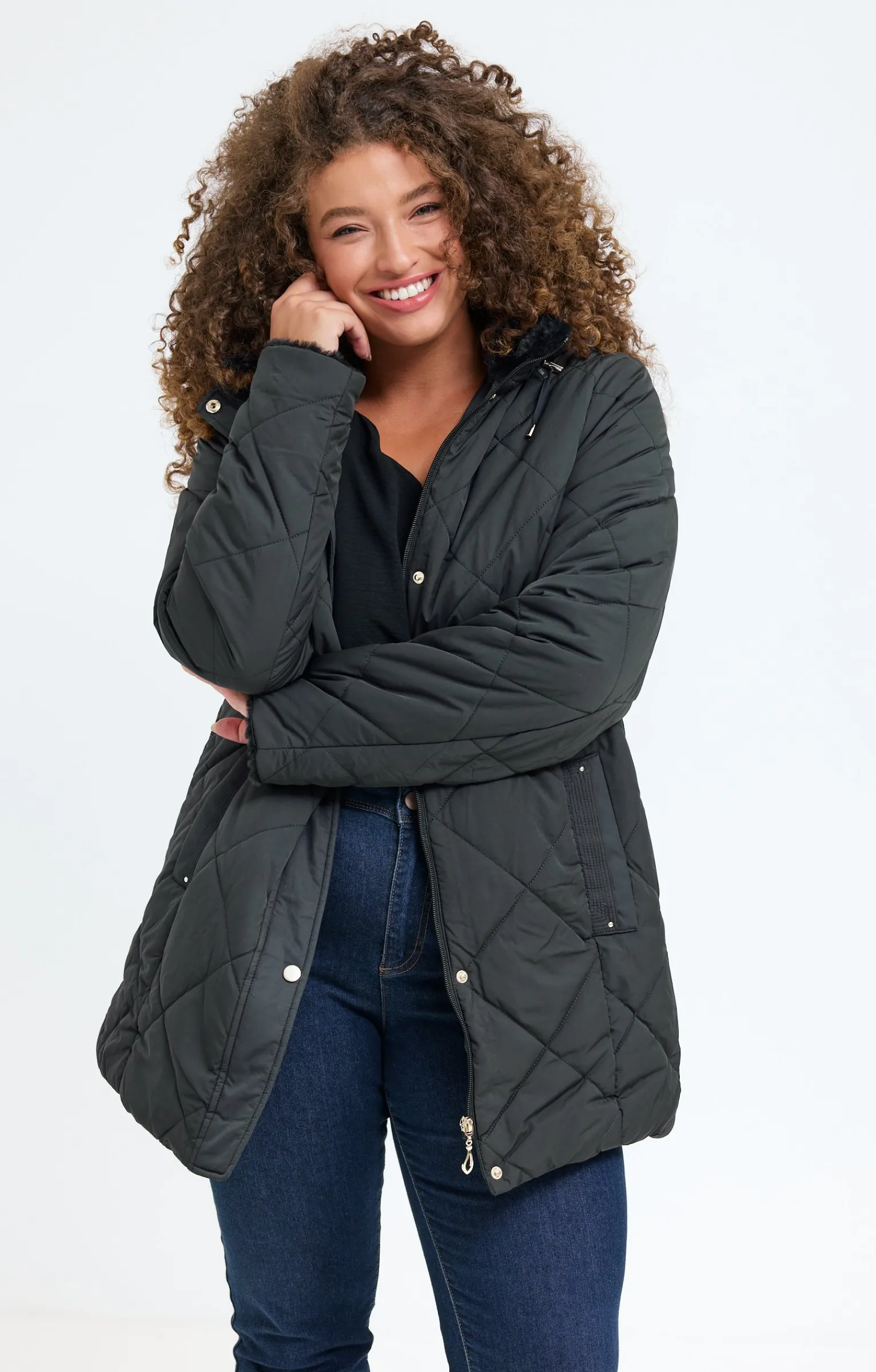 Parka mi-longue à capuche. Coupe droite. Longueur mi-cuisses. Manches longues à emmanchures droites. Col montant avec capuche amovible par un zip. Fermeture zippée dissimulée sous une patte pressionnée. 2 poches raglan devant. Coloris uni. Matelassage à grands motifs losanges. Cordon de serrage à la capuche. Poignets et intérieur du col fourrés. Modèle doublé.