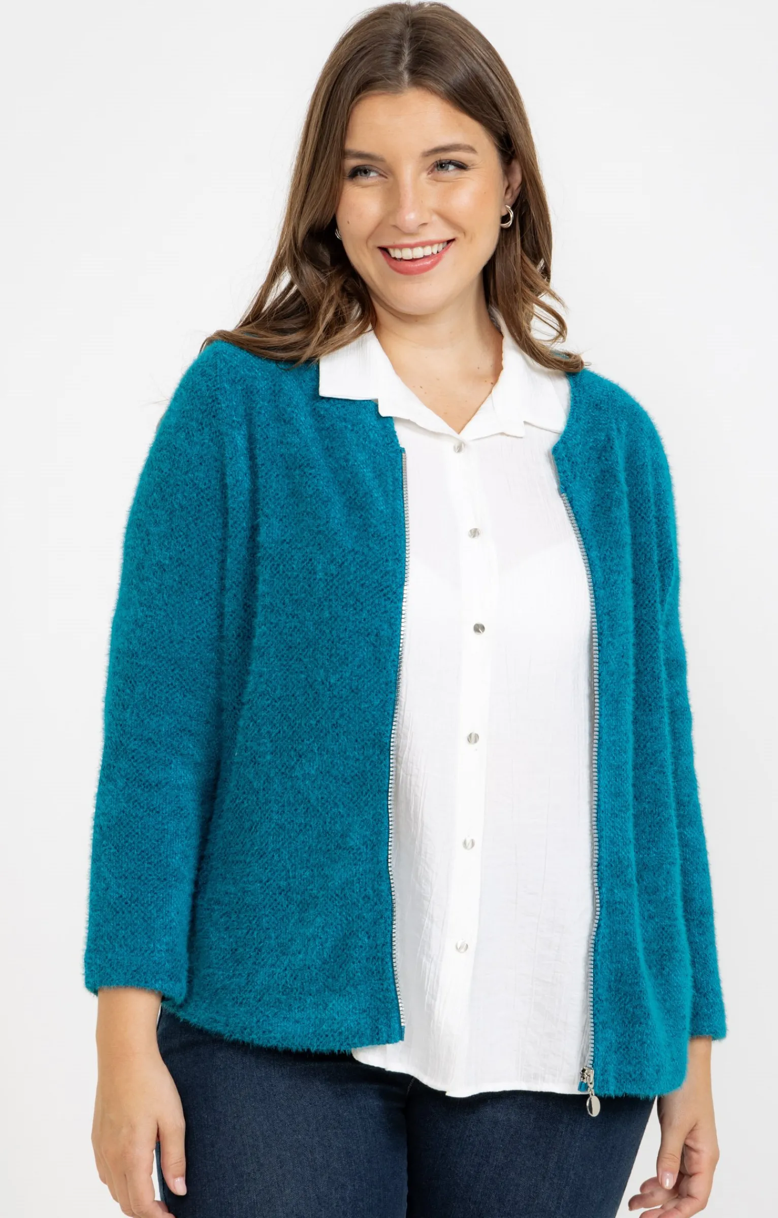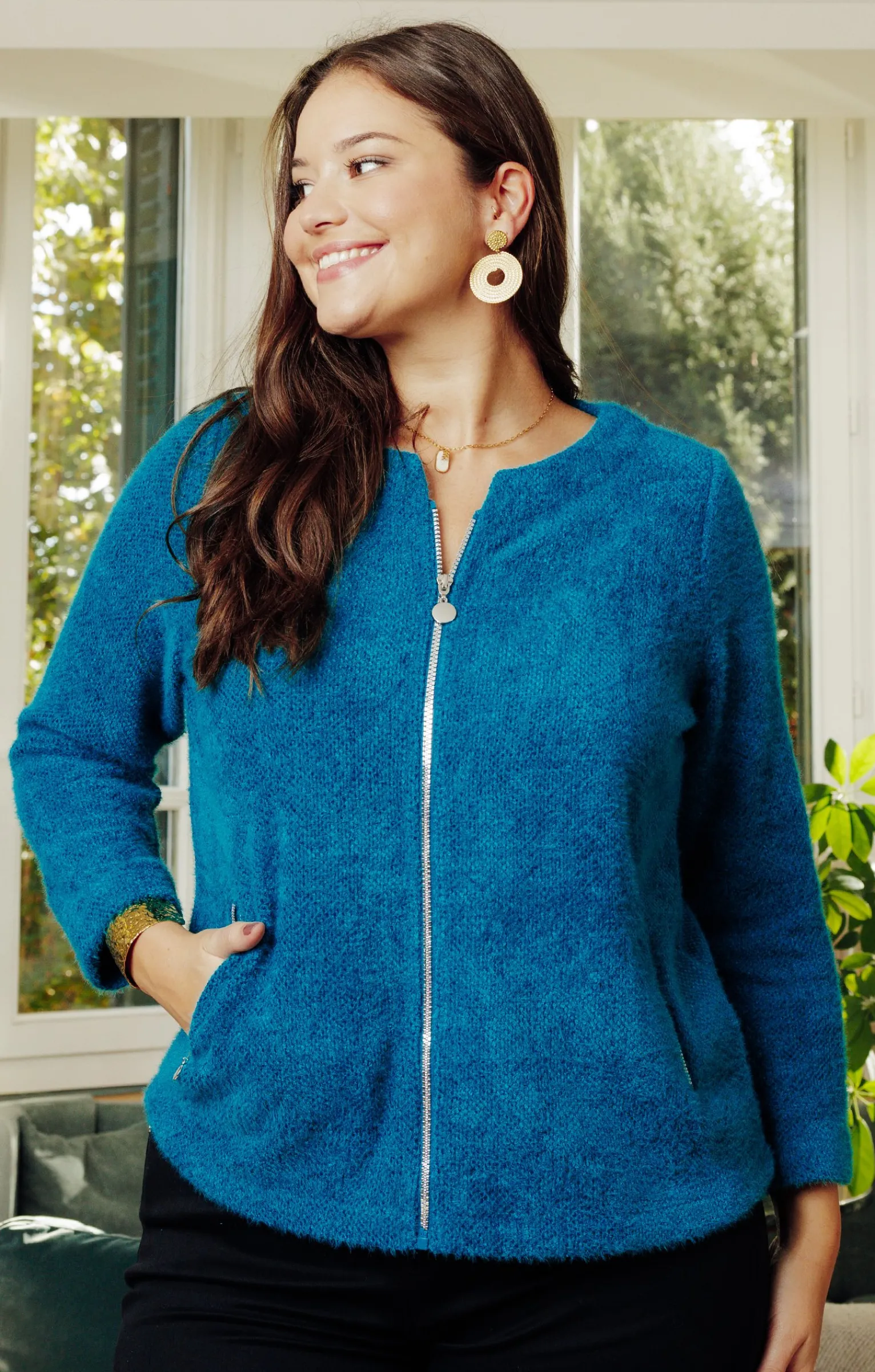 Restez bien au chaud en complétant votre tenue par ce cardigan zippé en maille duveteuse. Cardigan zippé en maille unie. Coupe droite. Manches longues à emmanchures droites. Col rond. Fermeture zippée sur le devant. Maille duveteuse unie.