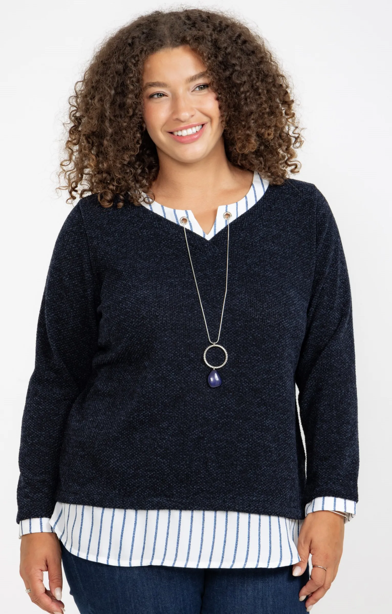 Pull 2 en 1 bimatière avec collier. Coupe droite. Manches longues. Emmanchures droites. Col rond avec ouverture V associé à un col V. Pull chiné. Effet chemisier à rayures bicolores. Maille extensible texturée. Toile. Œillets métalliques au col. Collier formé d’une chaîne en maille serpent ronde avec pendentif anneau métallique torsadé et pendentif façon pierre polie.