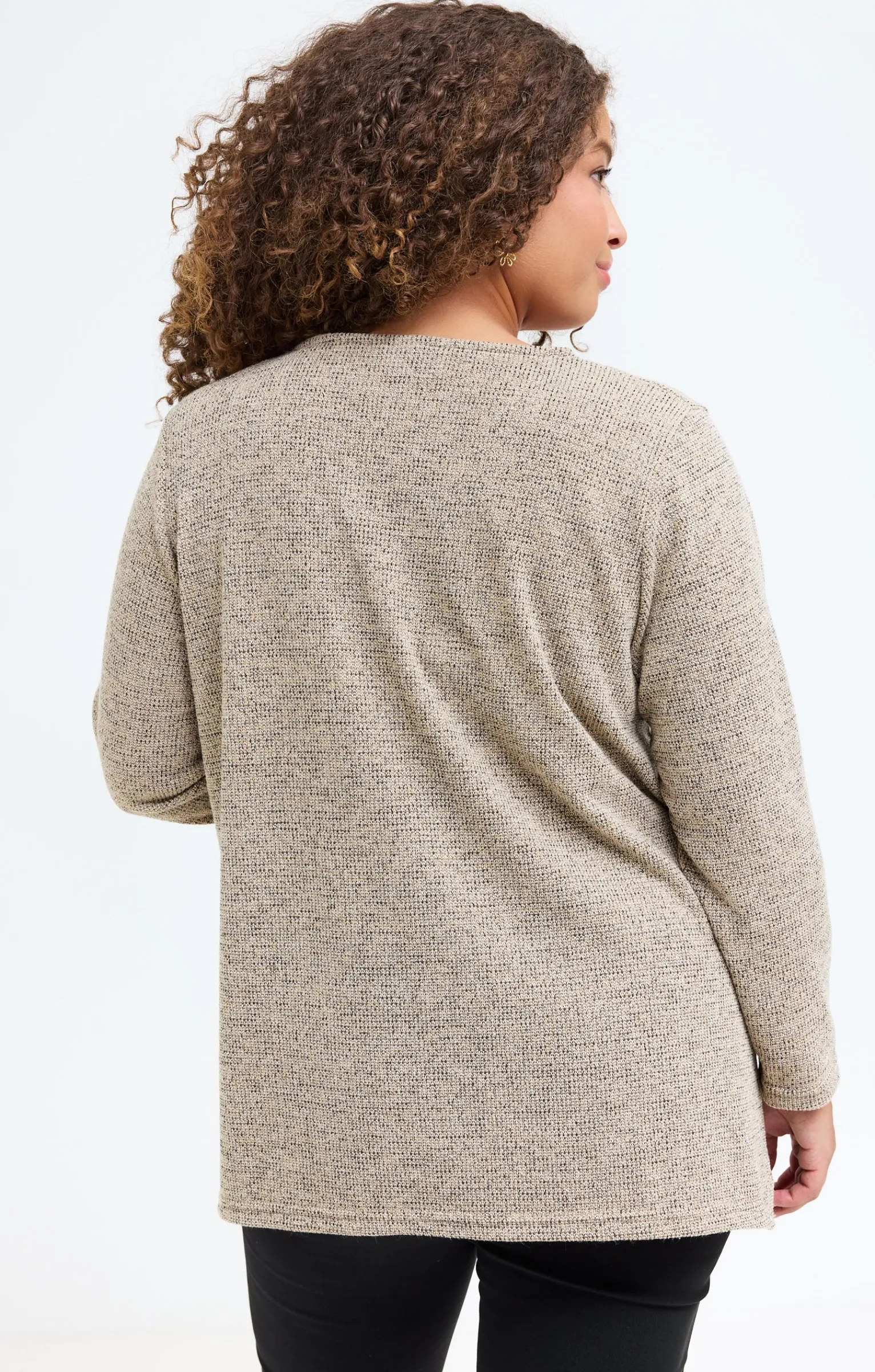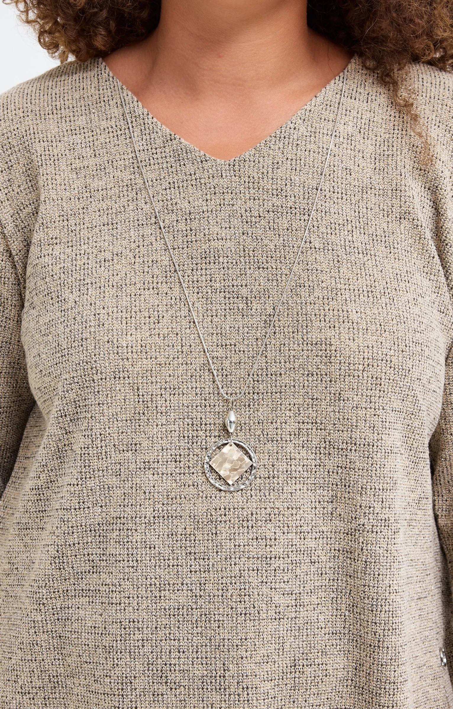 Pull à manches longues avec collier. Coupe fluide. Manches longues. Emmanchures droites. Col V. Coloris chiné. Maille texturée tissée de fils métallisés. Découpes géométriques à la base devant. Boutons en métal à motifs effet quadrillage sur découpes. Collier en maille serpent rond avec pendentif mobile anneau marbré, perle et pastille en métal.