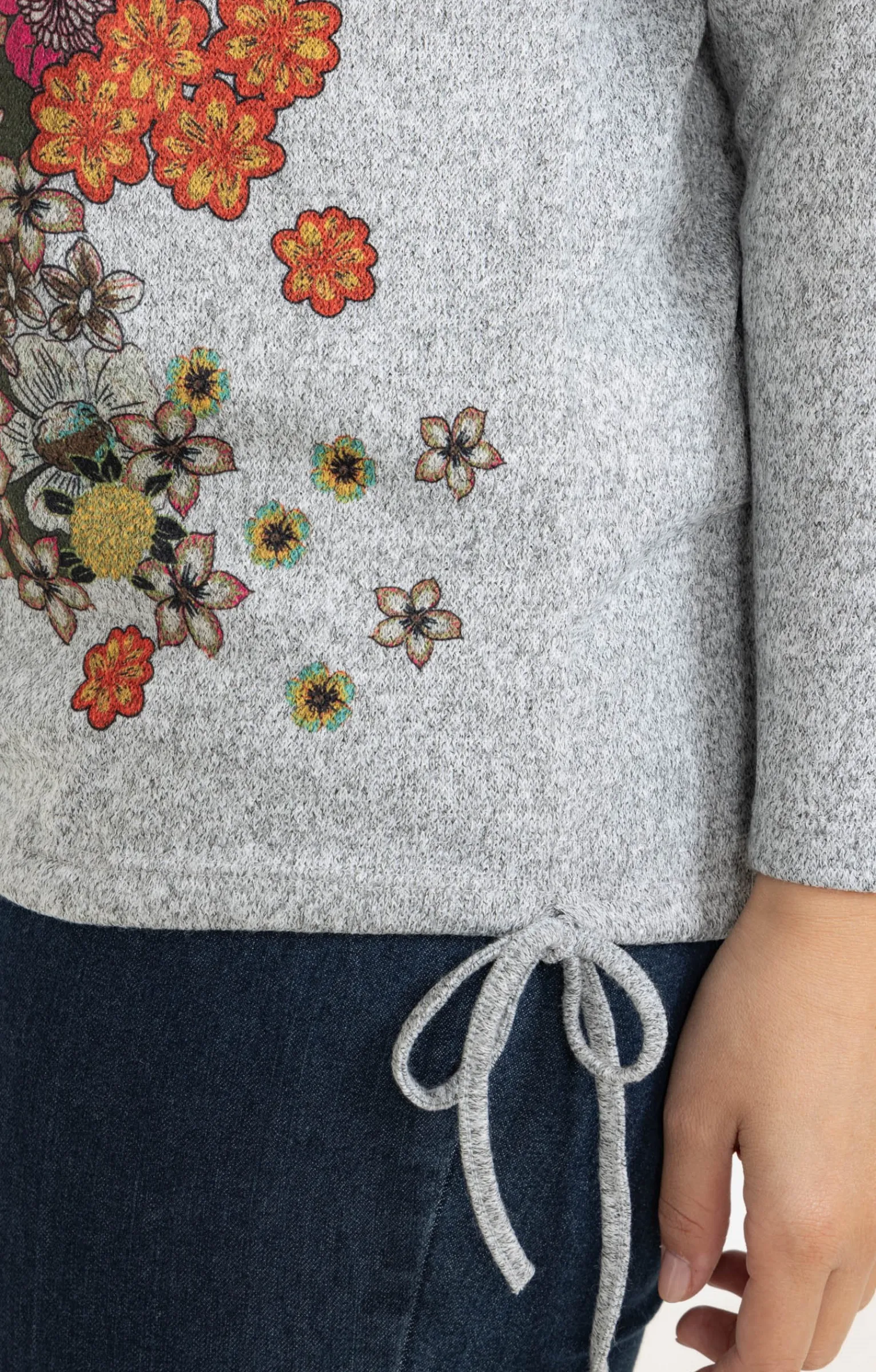 Pull à manches longues imprimé floral multicolore et base nouée. Coupe subtilement ajustée. Manches longues. Emmanchures droites. Col rond. Manches et dos chinés. Guirlande de fleurs multicolores imprimée devant. Tricot extensible en maille jersey. Lien assorti sous coulisse à nouer de façon latérale à la base.