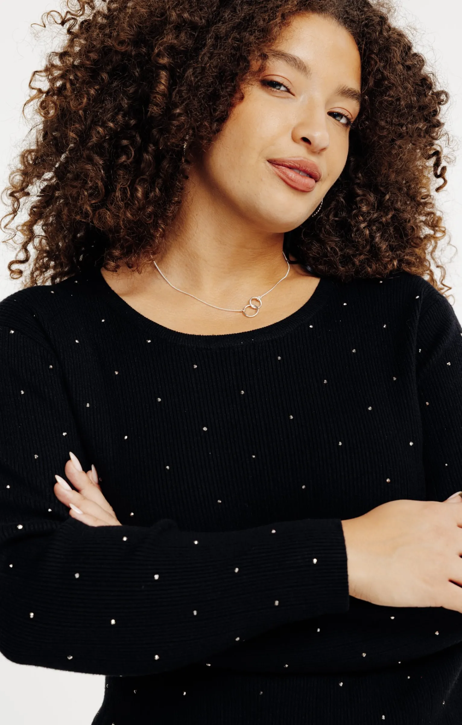 Pull uni côtelé à manches longues et strass. Coupe subtilement ajustée. Manches longues montées sur des emmanchures droites. Col rond. Teinte unie. Maille fine tricotée en côtes larges 4×1. Col, poignets et base en bord-côtes. Application de strass contrastés devant et sur les manches. Base droite.