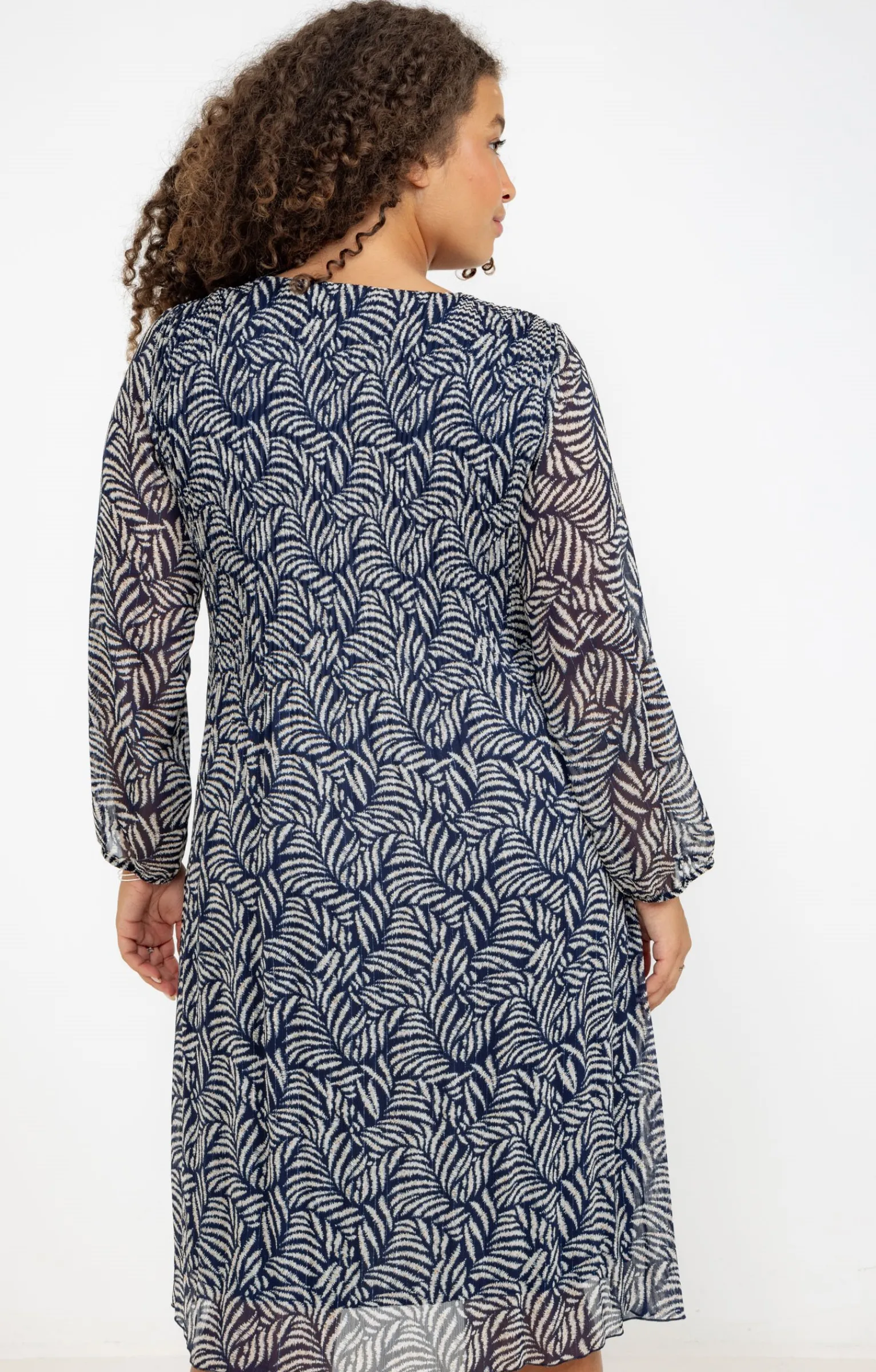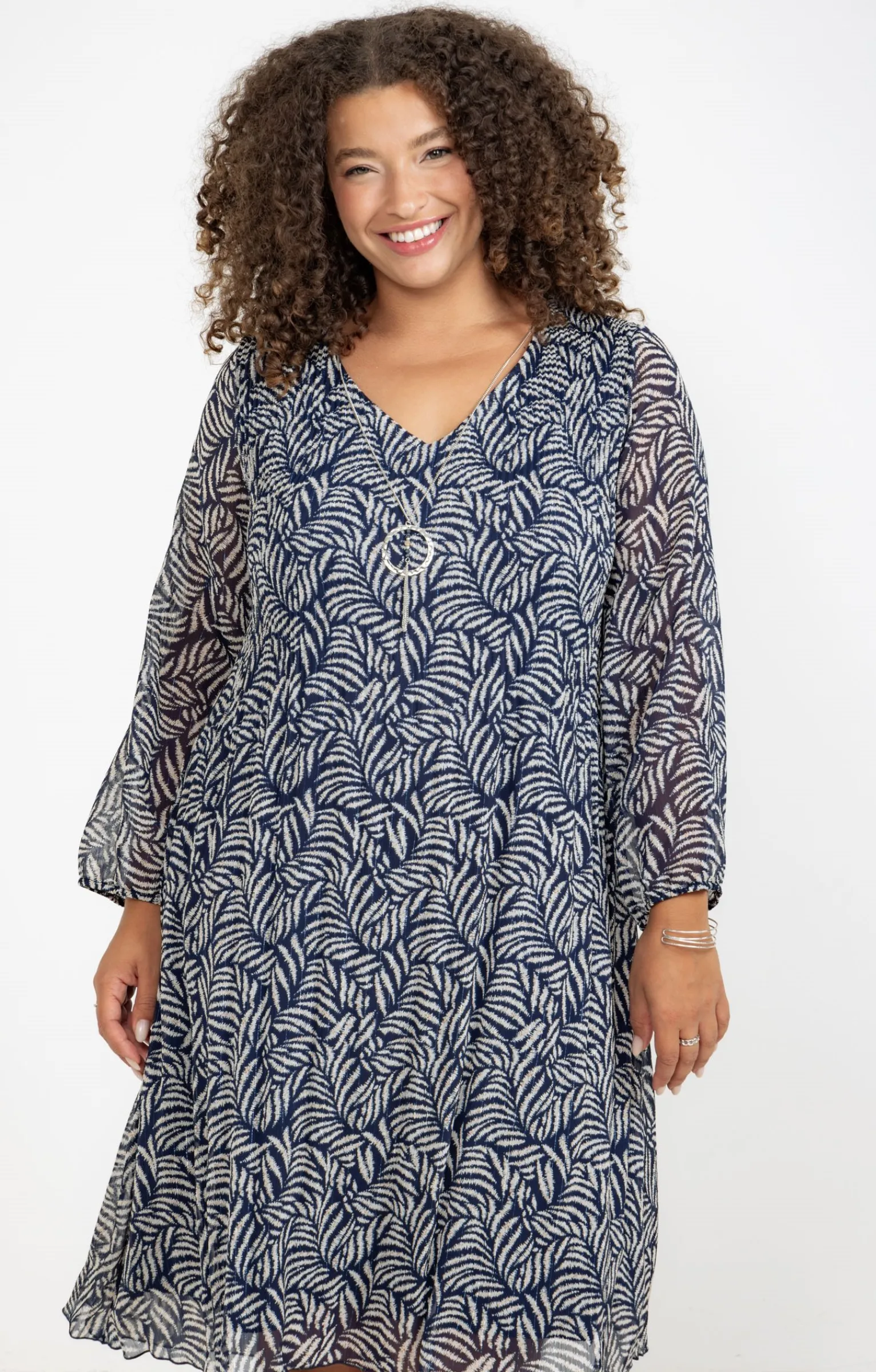 Robe plissée en voile imprimé avec collier. Coupe cintrée. Manches longues légèrement bouffantes non doublées. Emmanchures droites. Décolleté V. Imprimé à motifs rameaux de feuilles multicolores. Voile de crêpe doublé. Modèle plissé jusqu’à la taille devant et au dos. Poignets élastiqués. Collier formé d’une chaîne en maille gourmette avec pendentif anneau martelé, perles multicolores et pampilles chaînettes.