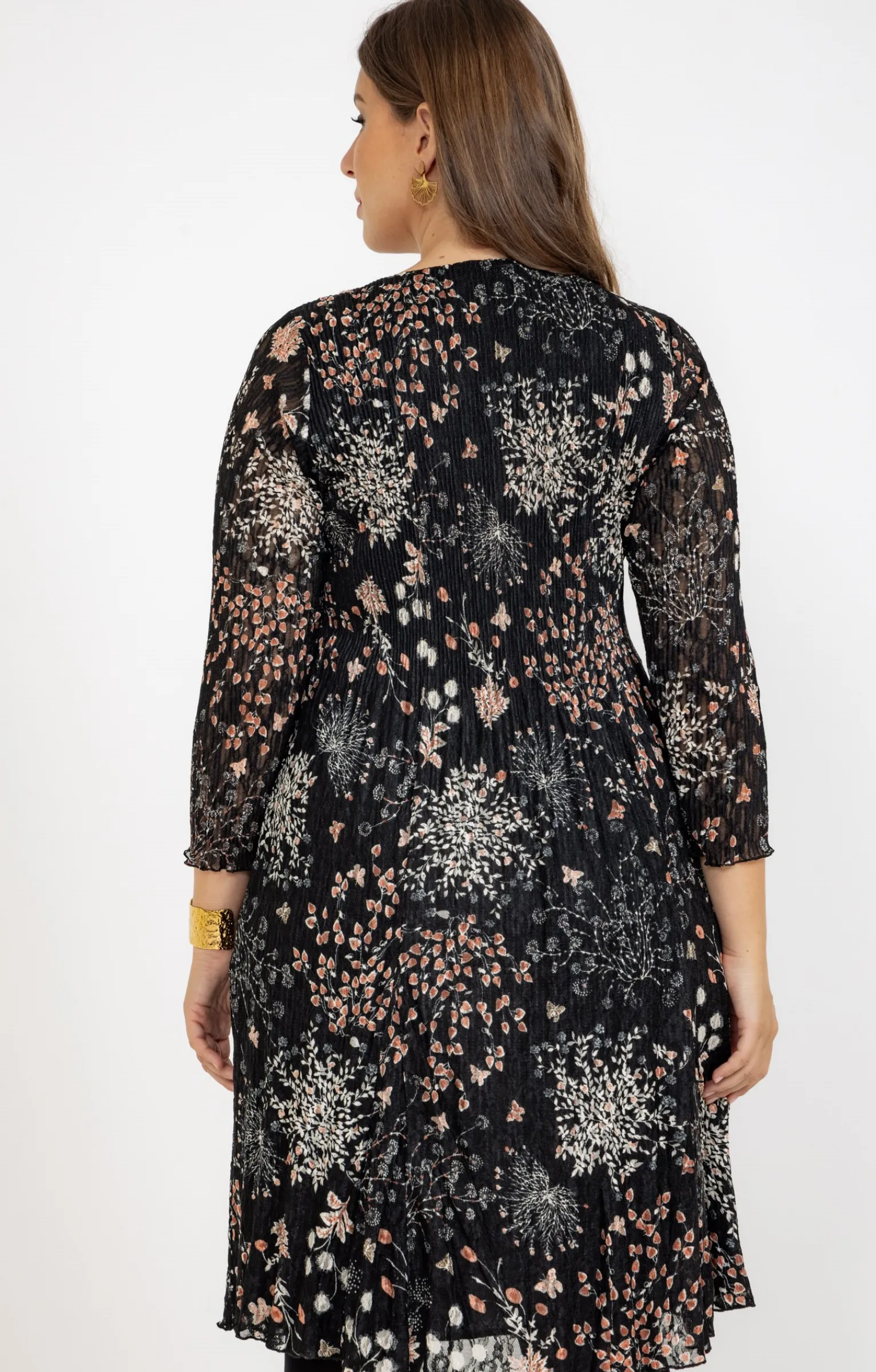 Robe plissée en résille dentelle imprimée à fleurs avec collier. Coupe cintrée midi. Manches 3/4 non doublées. Emmanchures droites. Col rond. Motifs floraux multicolores imprimés. Résille dentelle doublée. Plissé fin des épaules jusqu’à la taille. Ourlets surpiqués. Collier sautoir avec chaîne en maille gourmette, perles ovales facettées et pendentifs à 2 anneaux martelés.