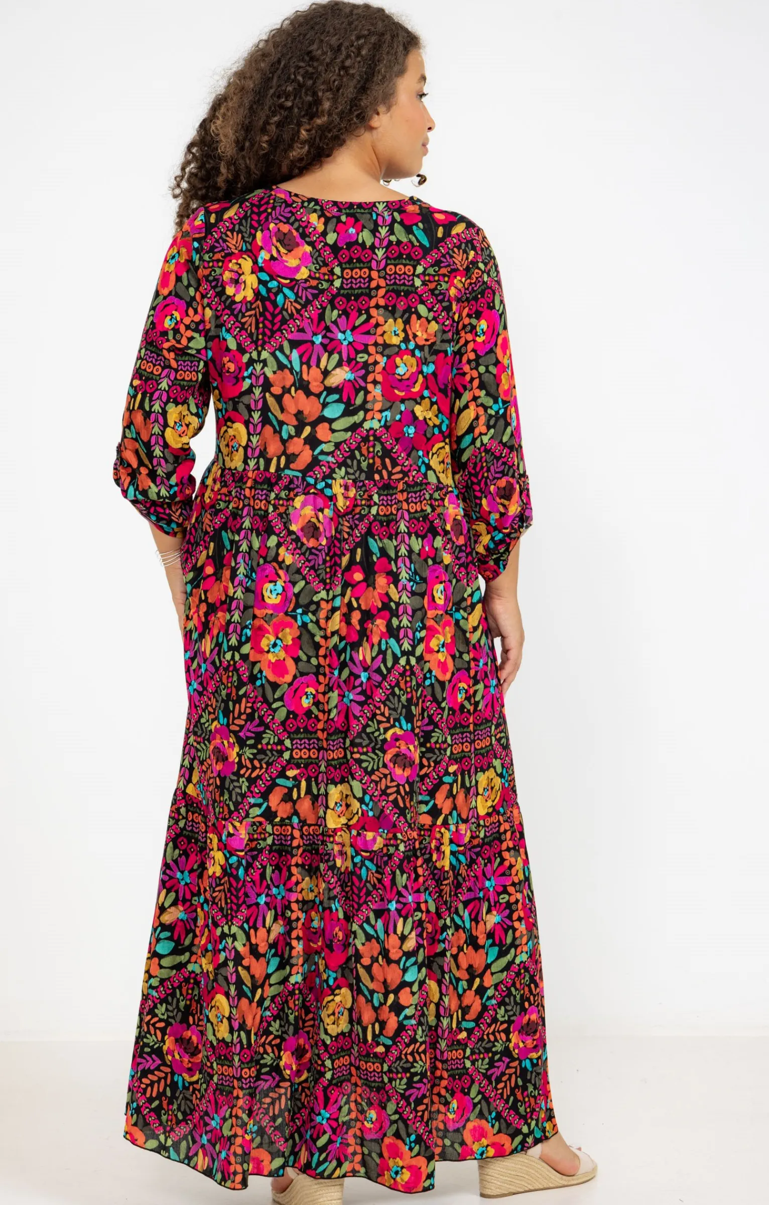 Robe longue à manches longues avec imprimé multicolore. Coupe fluide longue. Manches longues. Emmanchures droites. Col rond avec découpe V. Fermeture boutonnée sous le col. Motifs floraux multicolores imprimés. Matière fluide. Taille empire. Découpe effet plastron devant. Fronces sous la taille. Finition volant froncé à la base. Manches retroussables à l’aide d’une patte de boutonnage.