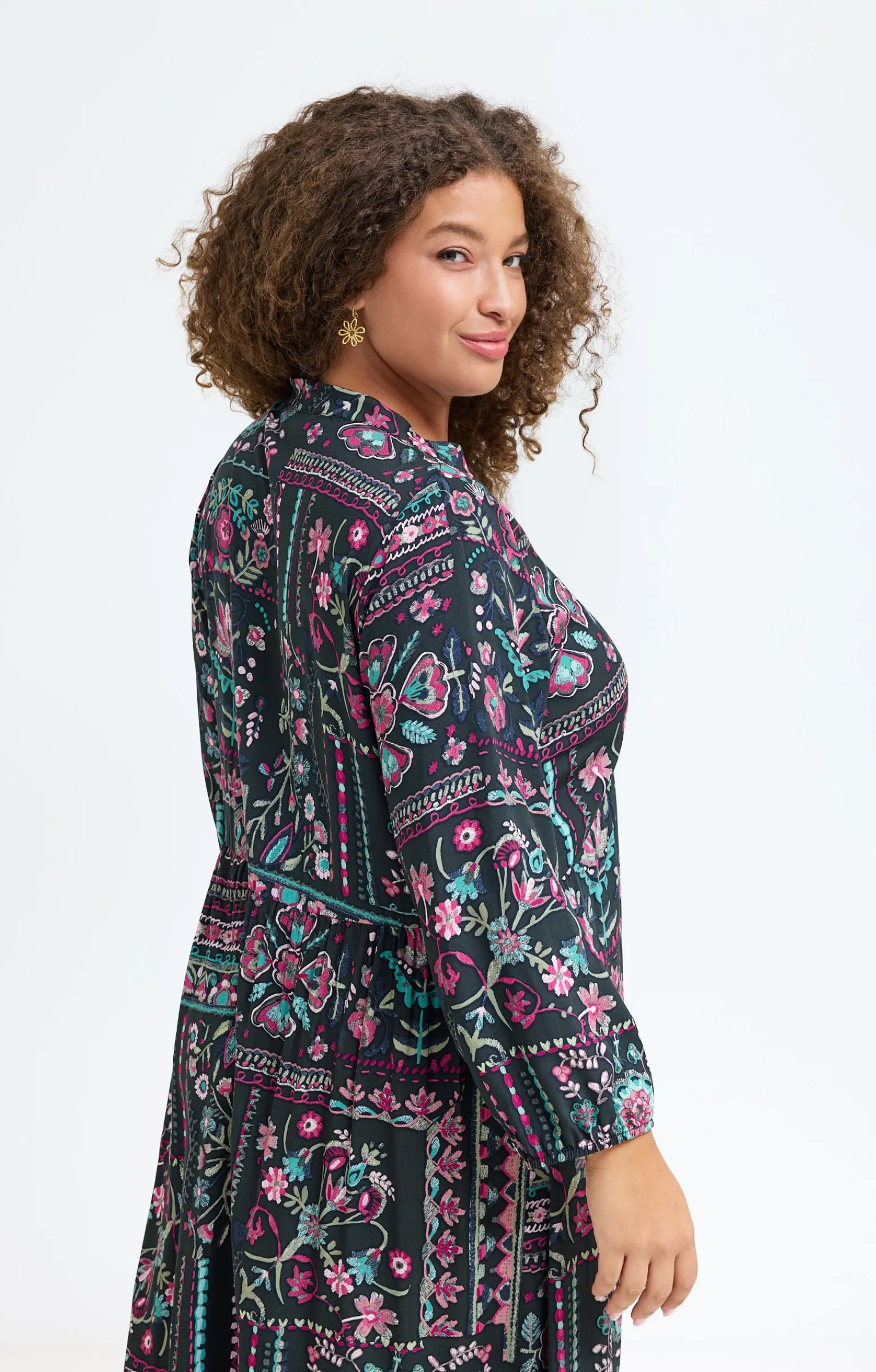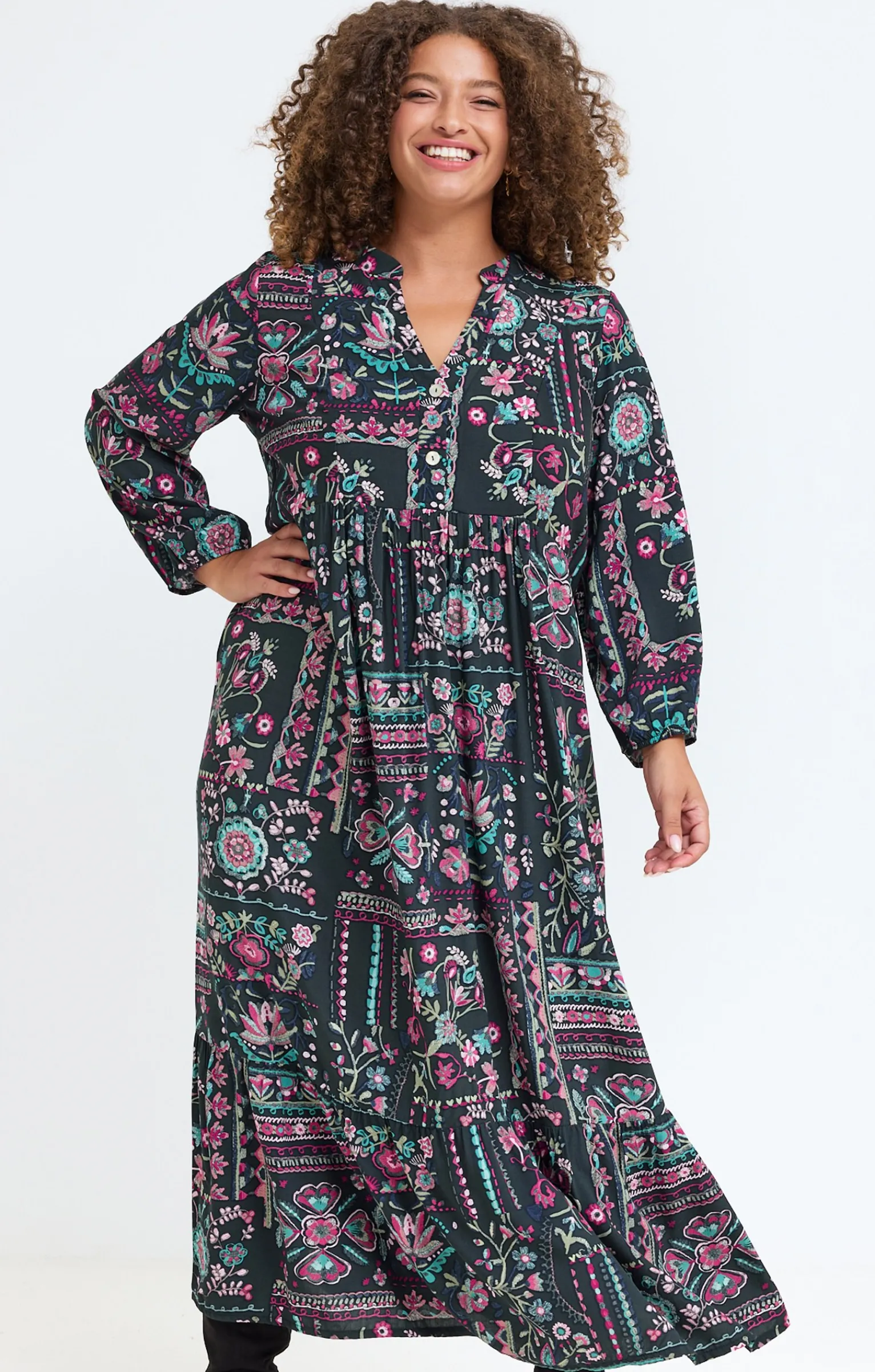 Robe bohème longue à manches longues avec imprimé multicolore. Coupe fluide longue. Manches longues. Emmanchures droites. Col rond avec découpe V. Fermeture boutonnée sous le col. Motifs floraux multicolores imprimés façon patchwork. Matière fluide. Taille empire. Découpe effet plastron devant. Fronces sous la taille. Finition volant froncé à la base. Poignets élastiqués.