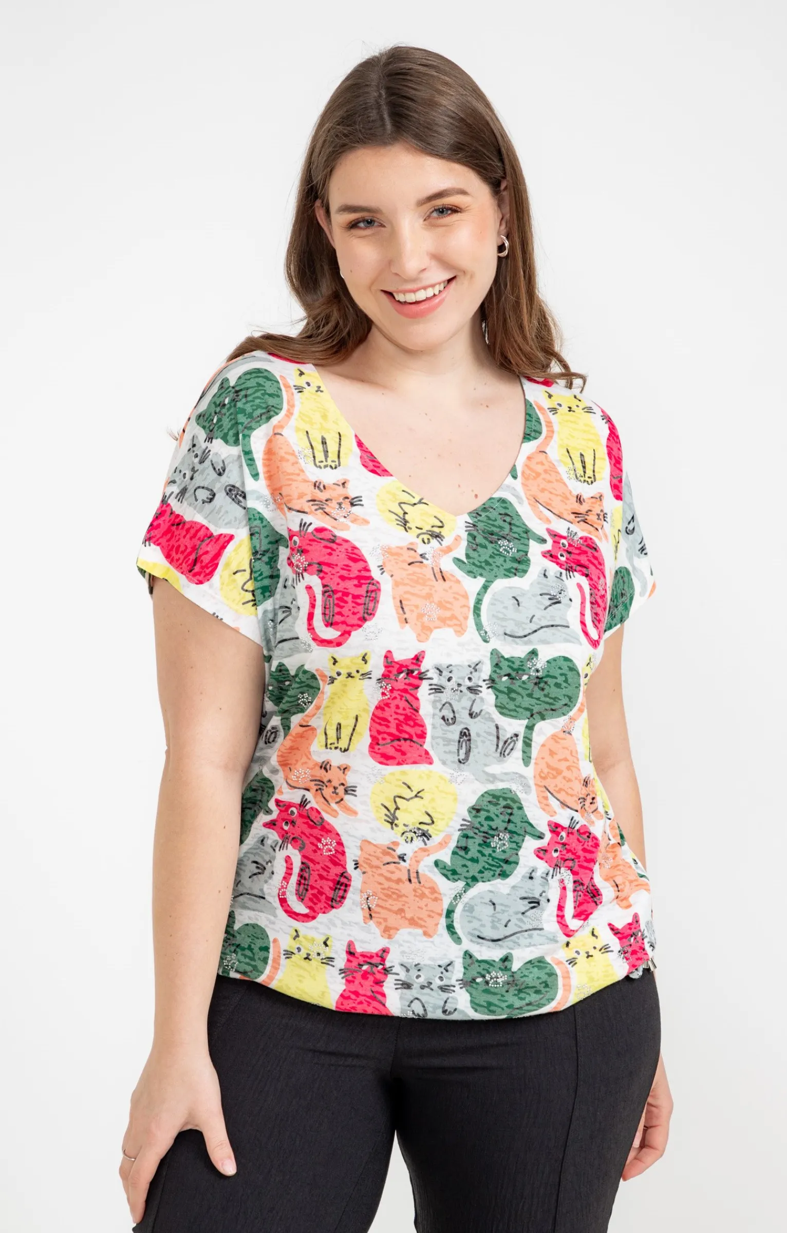 T-shirt oversize multicolore motifs chats à col V et manches courtes. Coupe oversize mi-longue. Manches courtes en T dans le prolongement du corps. Col en V échancré. Imprimé multicolore motifs chats dans toutes les positions. Matière fine et souple. Détails empreintes de pattes en clous métalliques à l’avant. Lien sous coulisse à nouer sur la taille pour un effet blousant.
