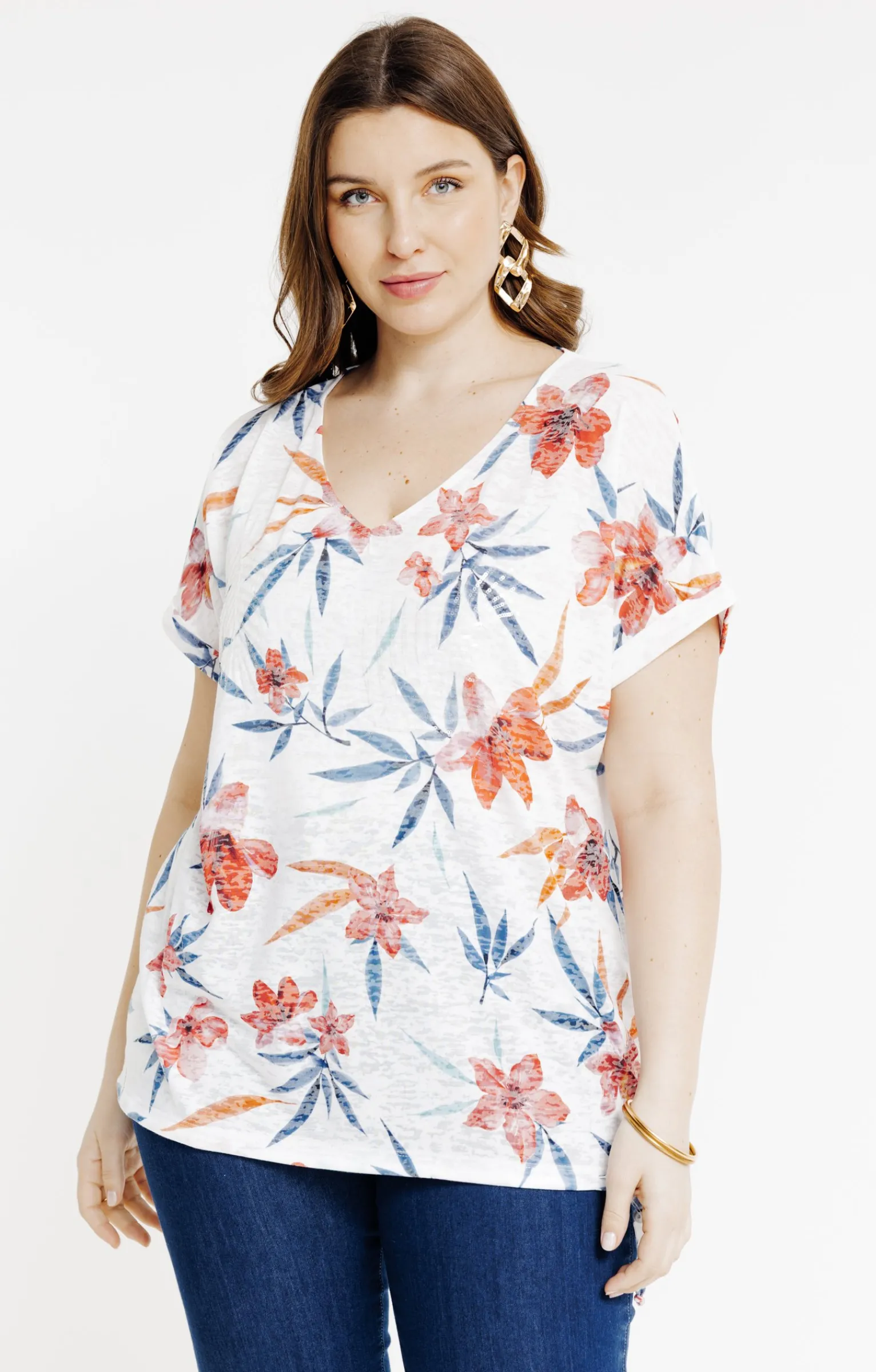T-shirt à manches courtes imprimé fleurs multicolores et lien en bas. Coupe droite. Manches courtes à revers. Sans emmanchures. Décolleté V. Fond tacheté filigrané avec imprimé bouquets de fleurs multicolores. Maille jersey. Lien sous coulisse à nouer sur le côté de la base. Base droite.