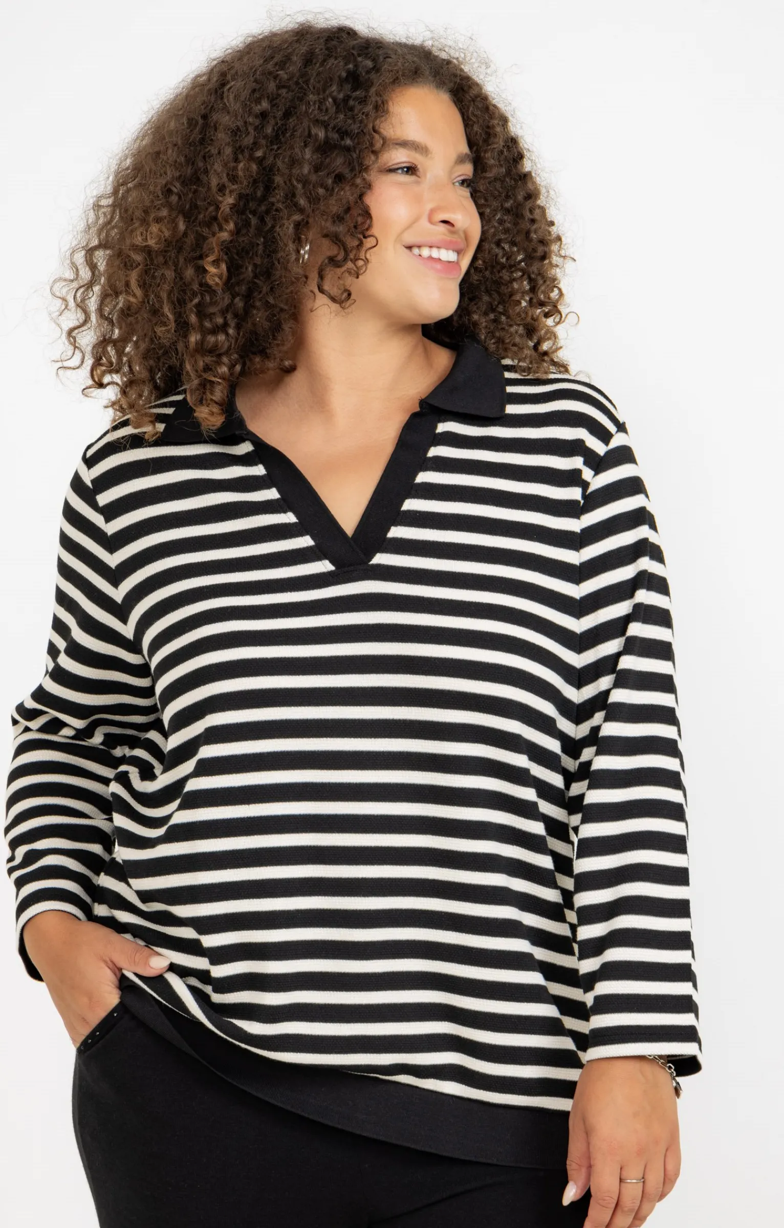 T-shirt à manches longues esprit polo rayé. Coupe droite. Manches longues. Emmanchures droites. Col classique avec ouverture V croisée. Motif à rayures horizontales bicolores. Maille fantaisie devant, dos et manches. Col et base en maille jersey unie en teinte assortie. Finition droite de la base.