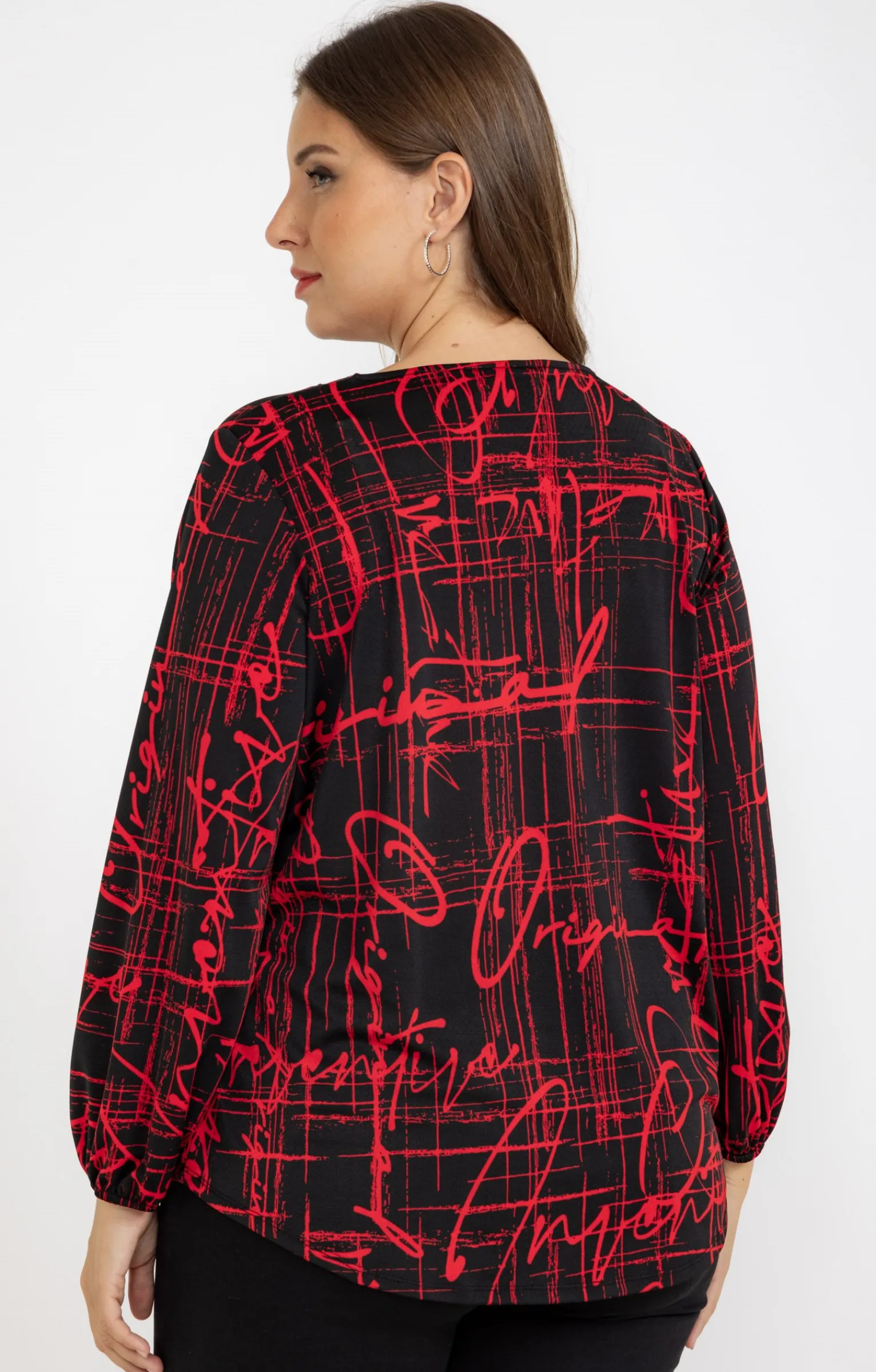 T-shirt imprimé graphique à manches longues et col V avec collier. Coupe droite. Manches longues avec poignets élastiqués. Col V avec collier en chaîne argentée et pendentif anneau, pompon, pierre ovale et détails perles. Imprimé graphique. Mix motifs lettrages et hachures. Motifs monochromes sur fond uni contrastant. Tissu façon crêpe extensible. Col avec détails passepoilés. Base arrondie.