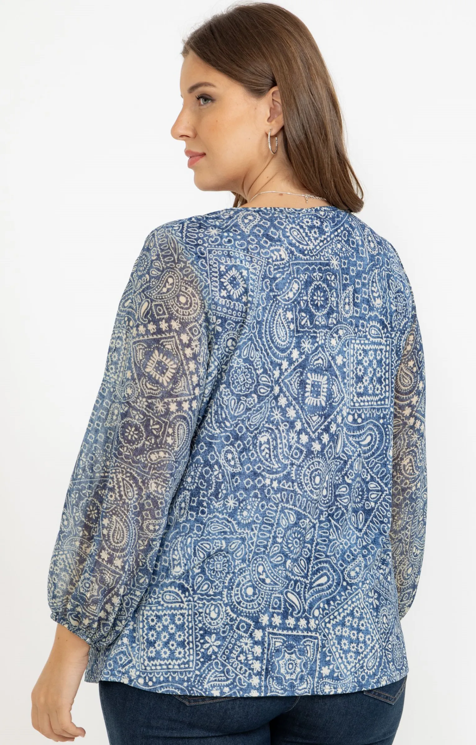 T-shirt imprimé cachemire à manches longues et col rond. Coupe droite. Manches longues avec poignets élastiqués. Col rond avec découpe en V et détails passepoilés unis. Imprimé cachemire. Tissu corps en maille extensible. Manches en voile avec fibres métalliques. Découpe façon plastron avec base à fines fronces au niveau de l’encolure. Base droite.