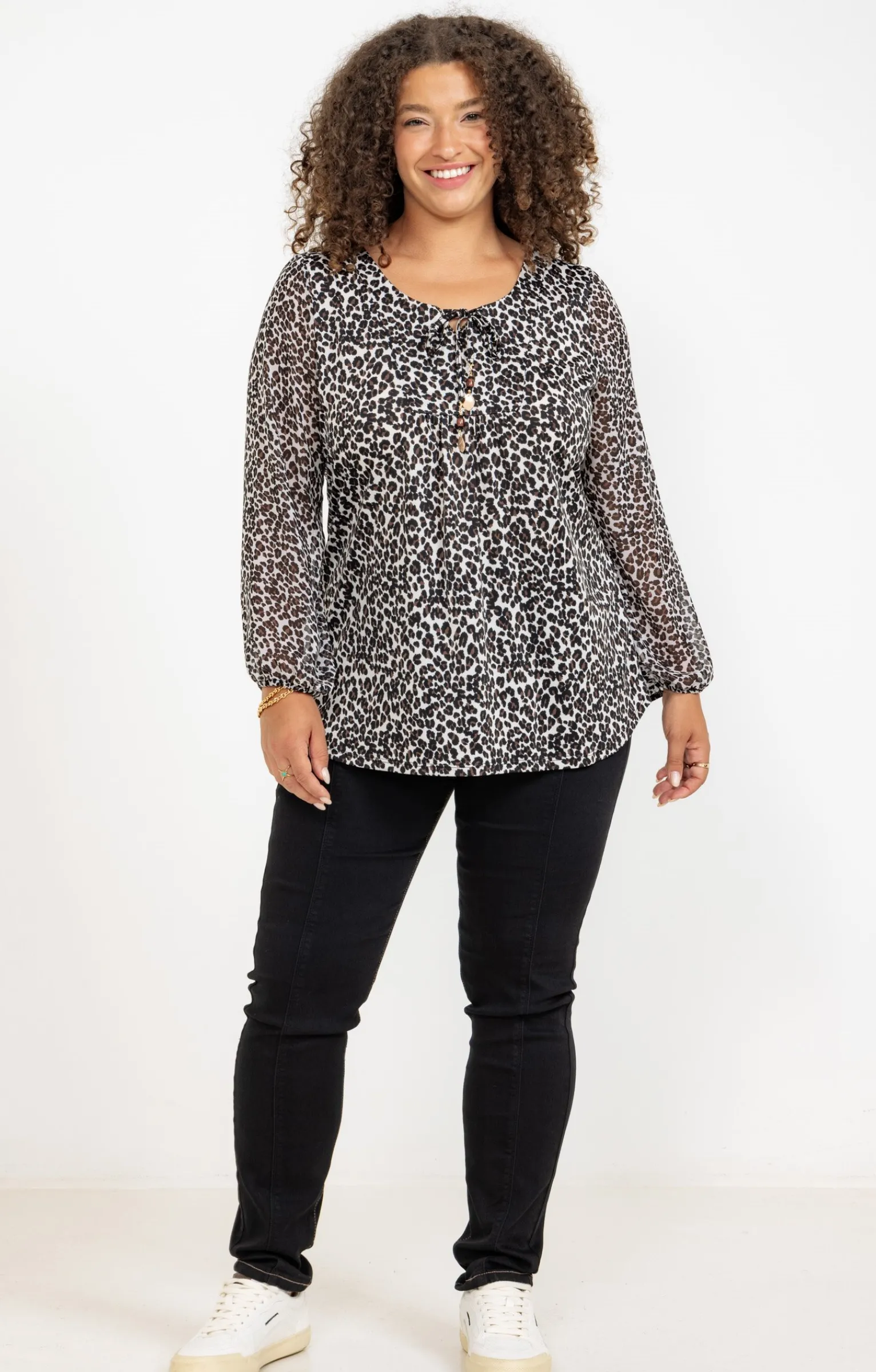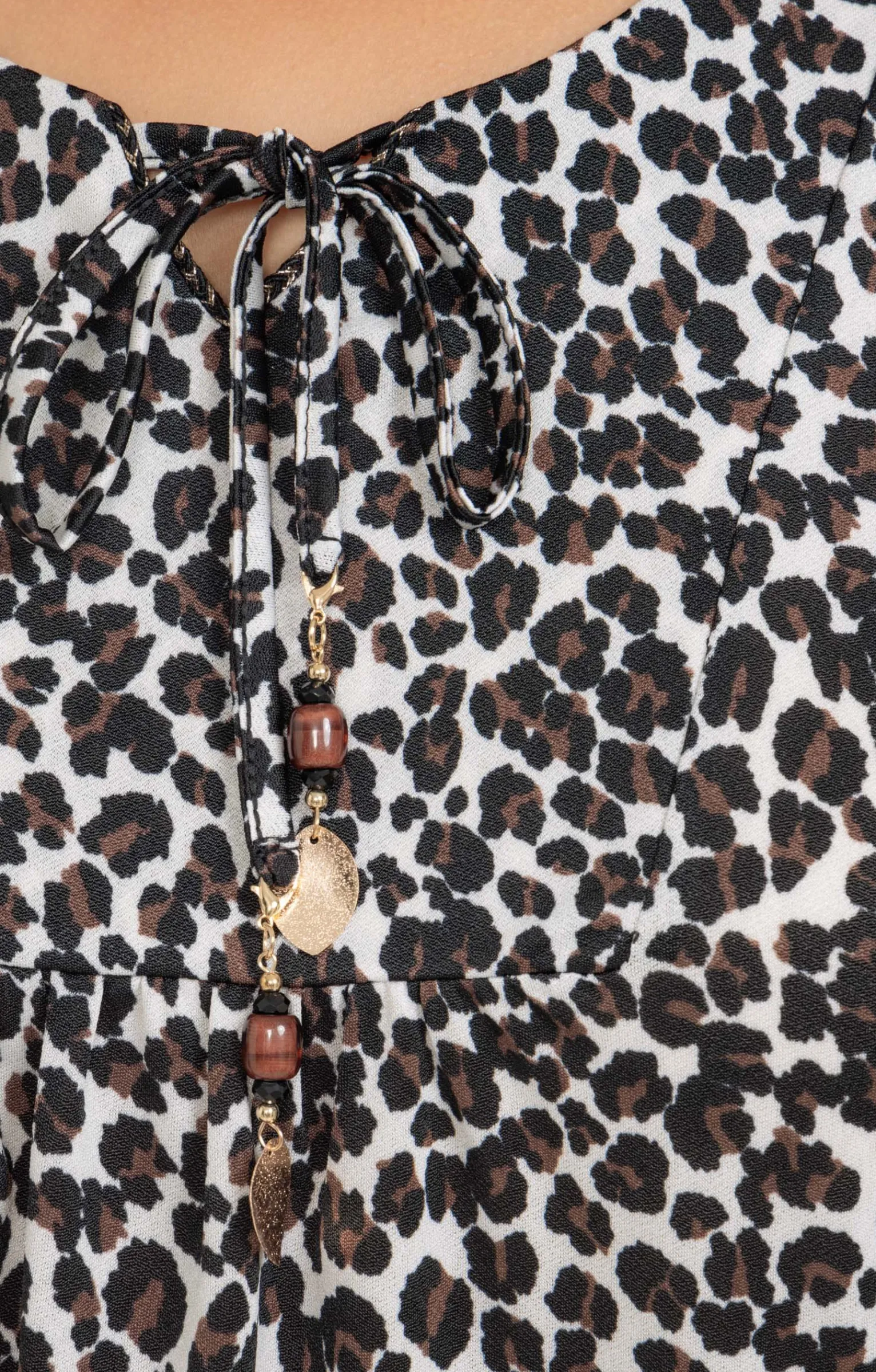 T-shirt fluide bimatière à manches longues imprimé léopard avec collier. Coupe droite. Manches longues. Col rond sur découpe V. Fermeture par lien à nouer au col. Imprimé léopard. Devant et dos en maille. Manches en voile. Fronces sous plastron devant. Galon tressé en finition du V au décolleté. Pampilles perles et ovales métalliques, amovibles par fermoir mousqueton en finition de la fermeture.