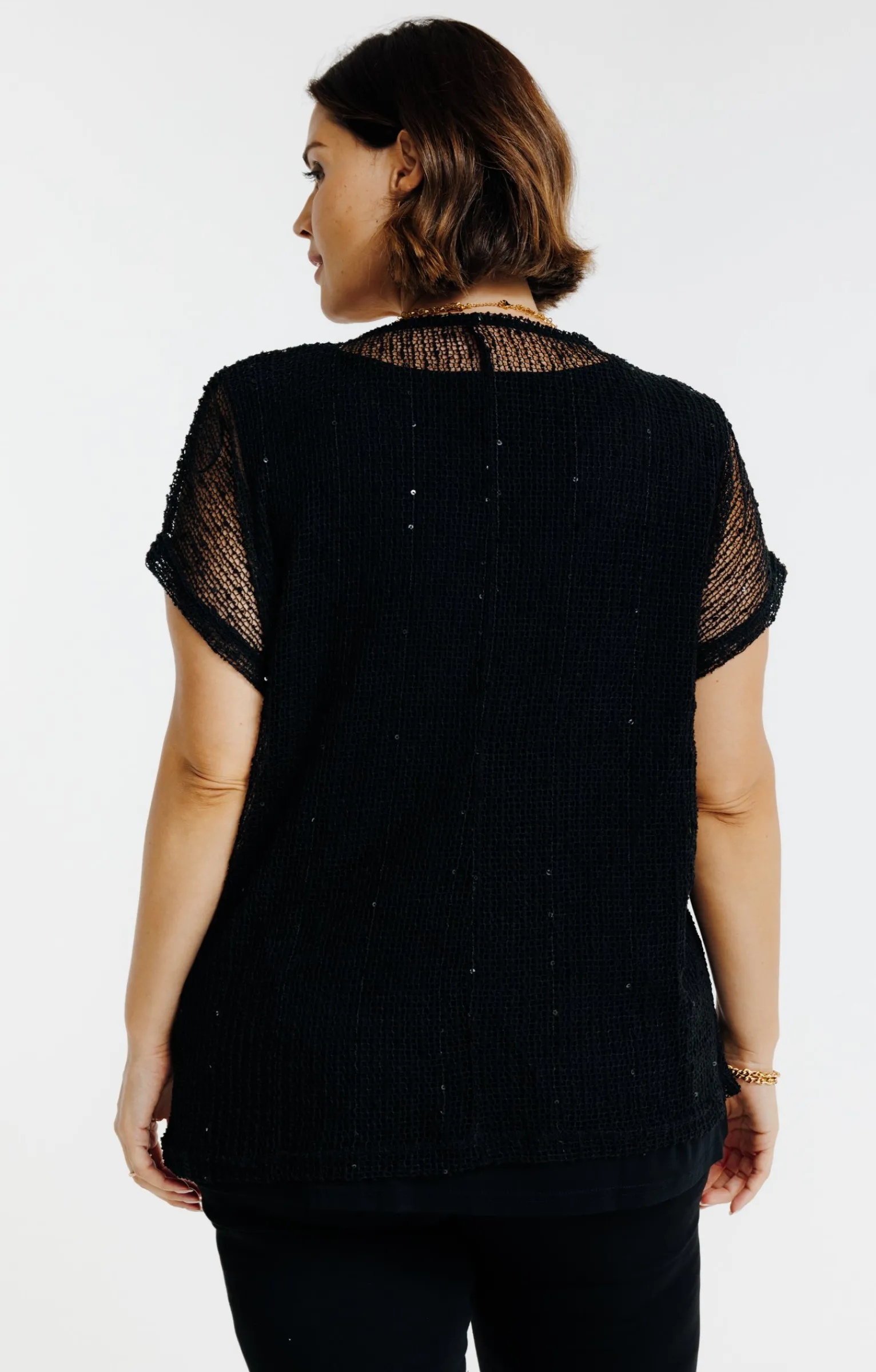 T-shirt à manches courtes en maille ajourée. Coupe droite. Col rond. Finition bord à bord. Tissu uni orné de strass discrets répartis sur l’ensemble du modèle. Effet de transparence sur les manches et le haut du buste. Notre mannequin Rafa mesure 1m75 et porte un t-shirt taille 1.