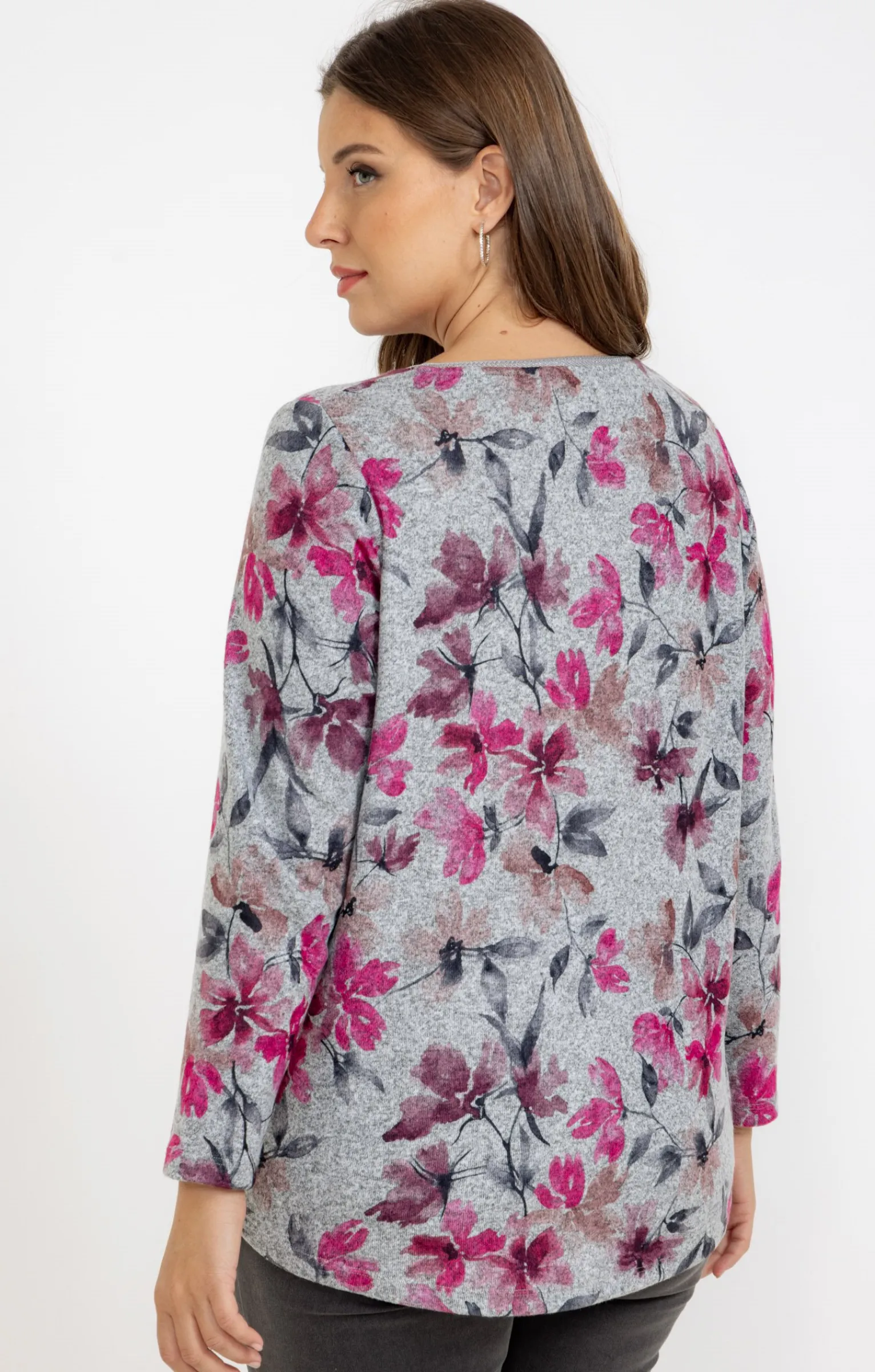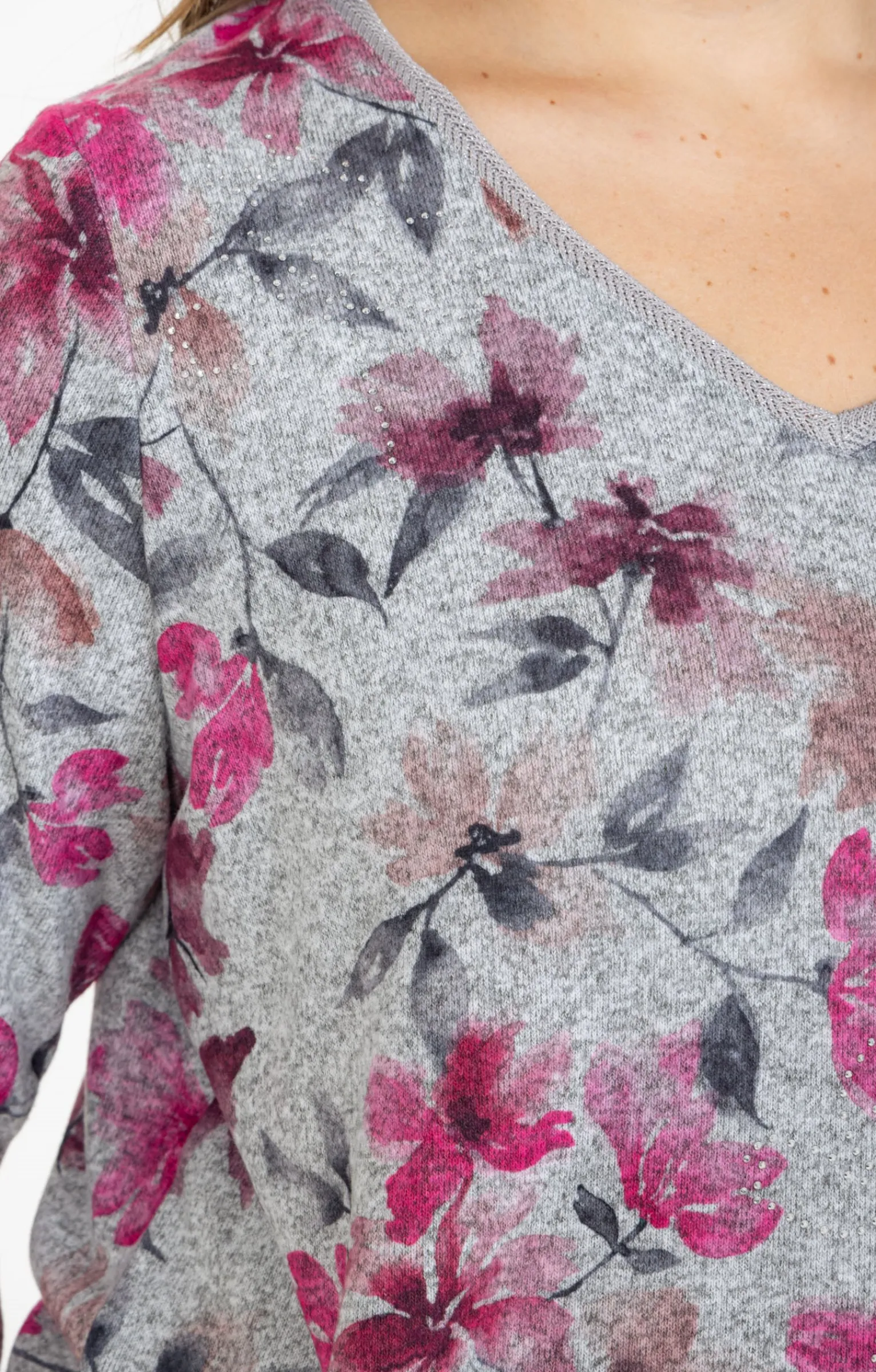 T-shirt en maille chaude imprimé floral à manches longues et col V. Coupe droite. Manches longues fuselées. Col V. Imprimé floral. Motifs mix grandes fleurs et feuillage effet aquarelle avec détails strass devant. Tissu en maille chaude aspect chiné. Matière extensible. Galon tressé uni en finition du col. Fines surpiqûres discrètes en finition du modèle. Base droite. Composition contenant du polyester recyclé.