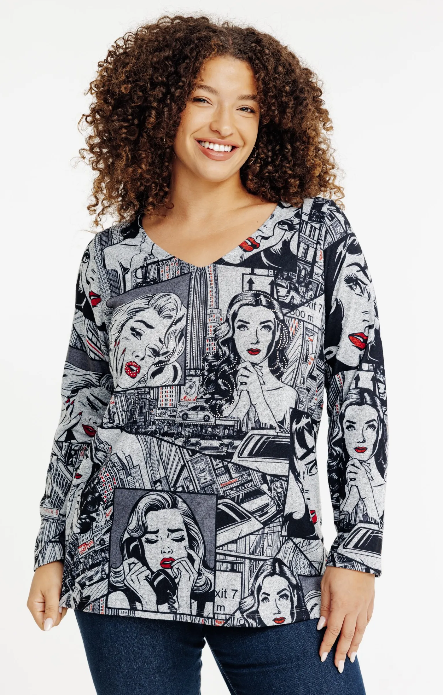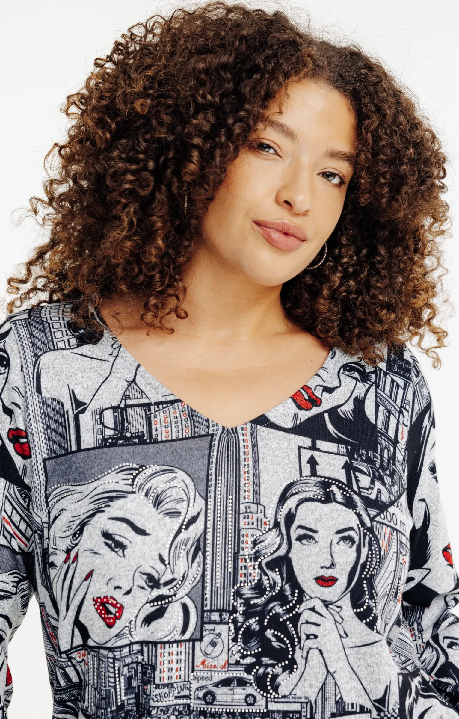 T-shirt en maille chaude imprimé bande dessinée à manches longues et col V. Coupe droite. Manches fuselées. Col V. Imprimé bande dessinée effet patchwork. Mix motifs femmes et paysages urbains. Détails strass devant. Tissu en maille chaude effet chiné. Matière extensible. Fines surpiqûres discrètes en finition du modèle. Composition contenant du polyester recyclé.