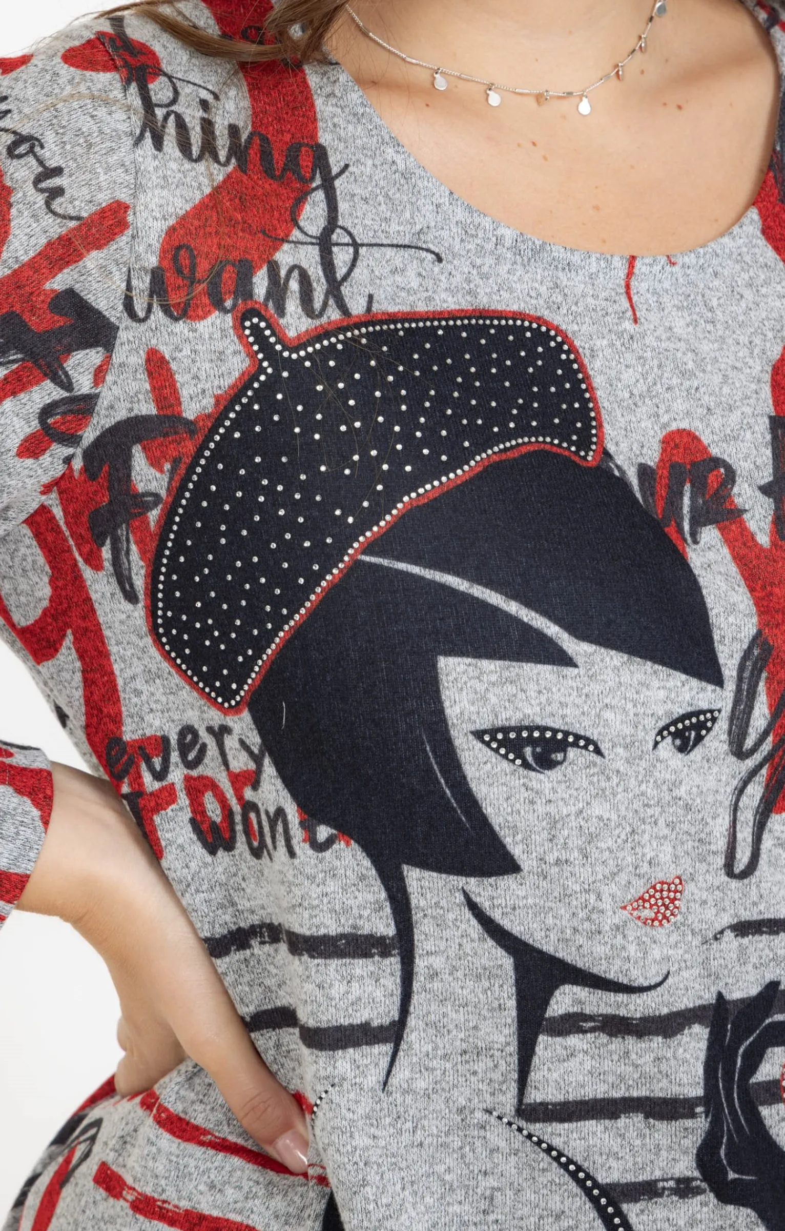 T-shirt imprimé silhouette femme et lettrage à manches longues et col rond. Coupe droite. Manches longues fuselées. Col rond. Grand motif silhouette femme avec strass et détails rayés devant. Lettrage avec effet de surimpression sur l’ensemble du modèle. T-shirt en maille effet chiné. Matière extensible. Base droite. Composition contenant du polyester recyclé.