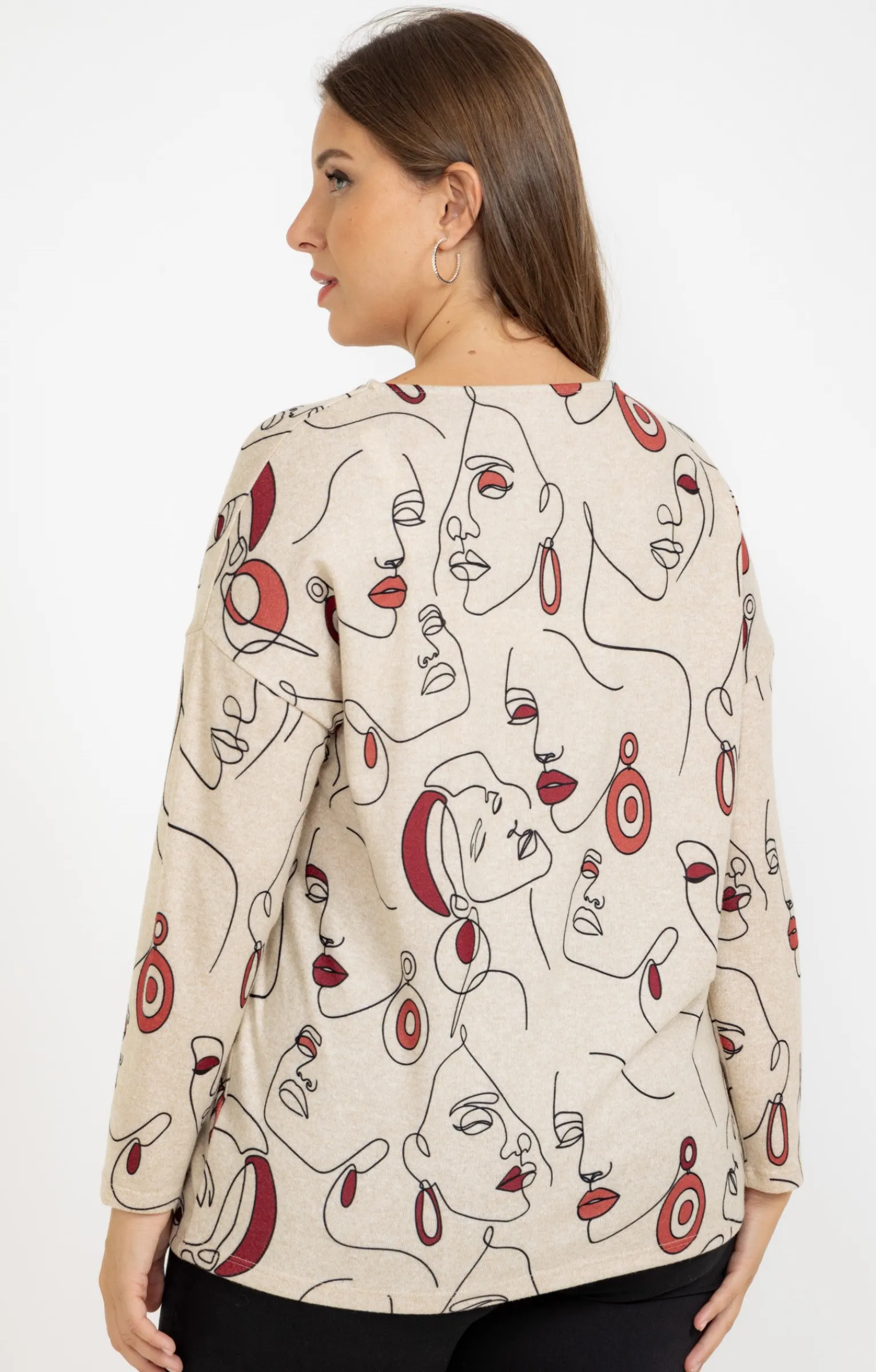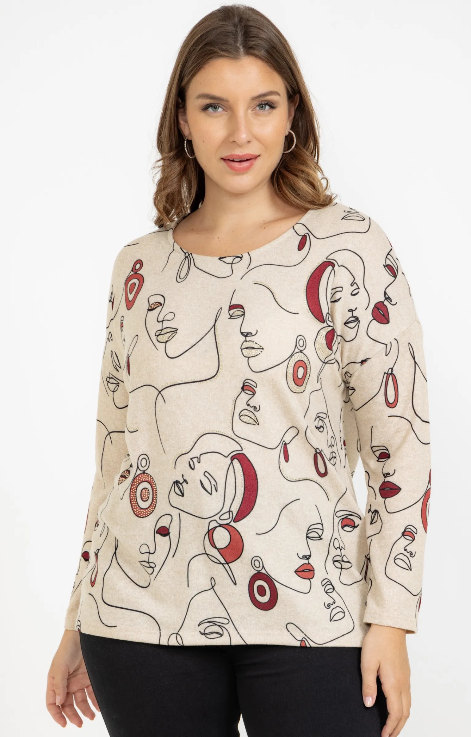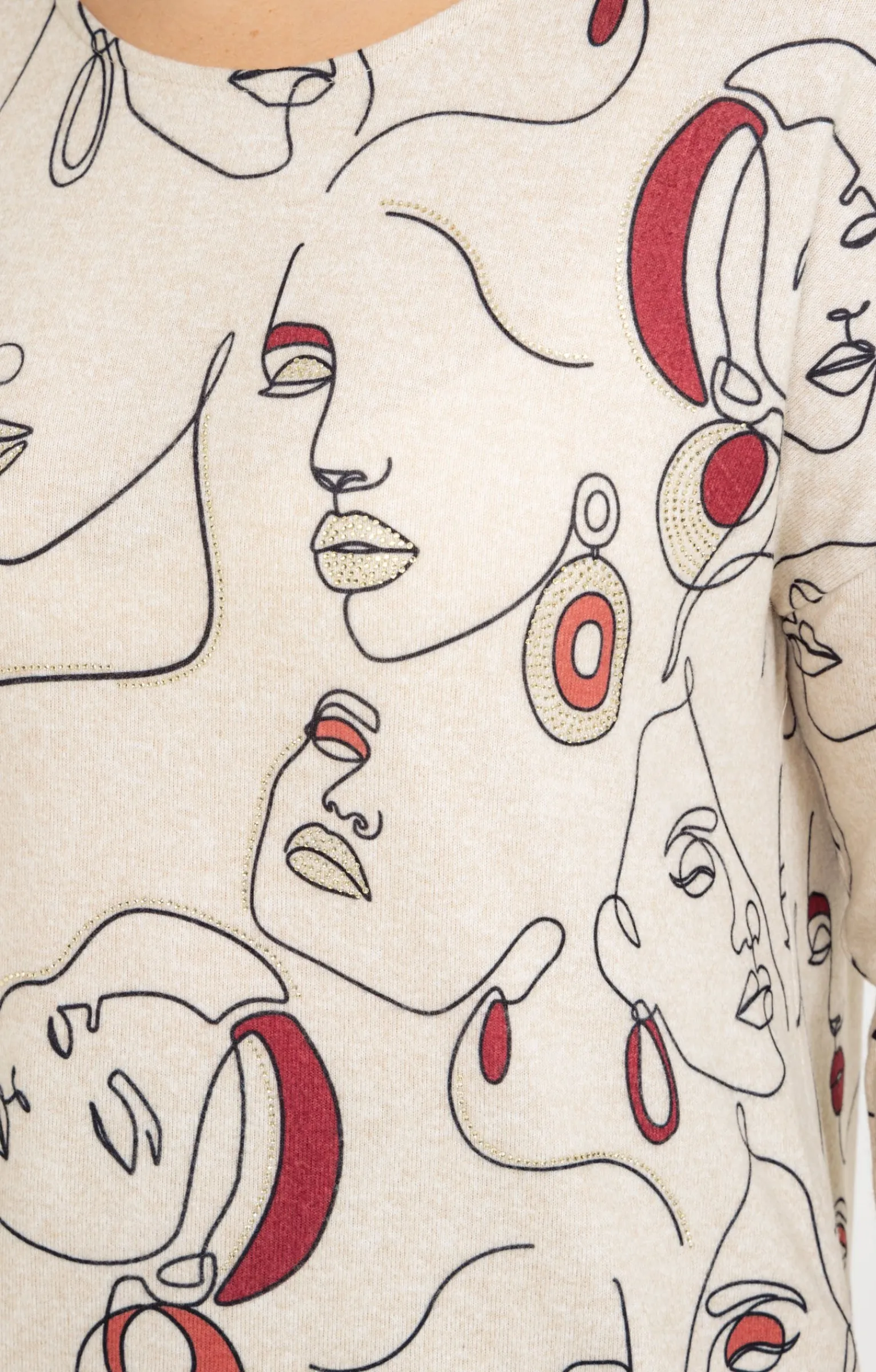 T-shirt imprimé visages en maille chaude à manches longues et col rond. Coupe droite. Manches longues avec emmanchures tombantes. Col rond. Imprimé silhouettes visages avec détails strass devant. Tissu en maille chaude extensible. Fines surpiqûres ton sur ton au col, aux poignets et à la base. Base droite.