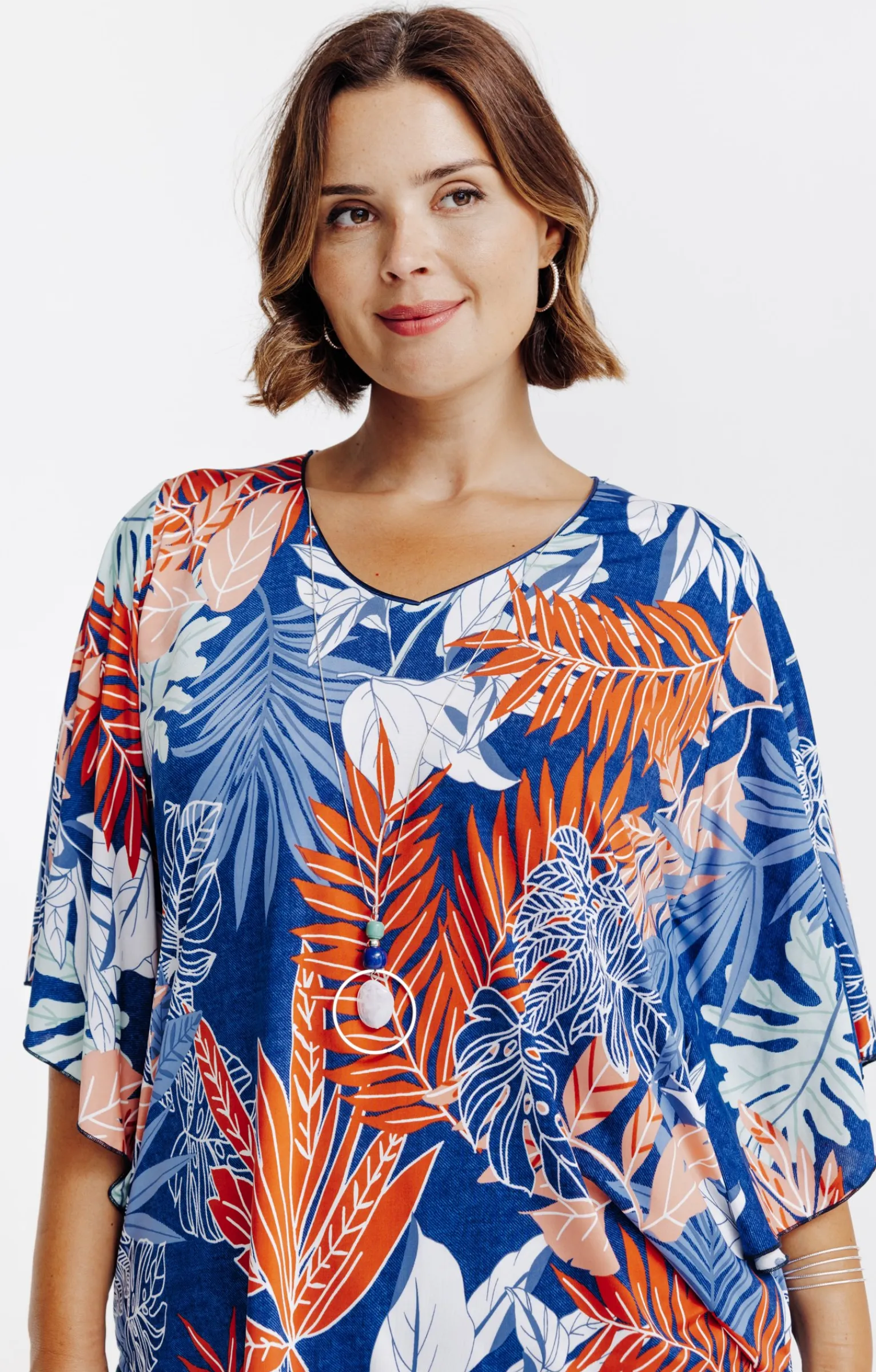 T-shirt imprimé à manches courtes et col en V. Coupe droite fluide. Manches amples à emmanchures basses. Longueur standard. Imprimé multicolore à motif végétal sur l’ensemble du modèle. Finition surpiquée à la base et aux manches. Collier intégré pouvant s’enlever.