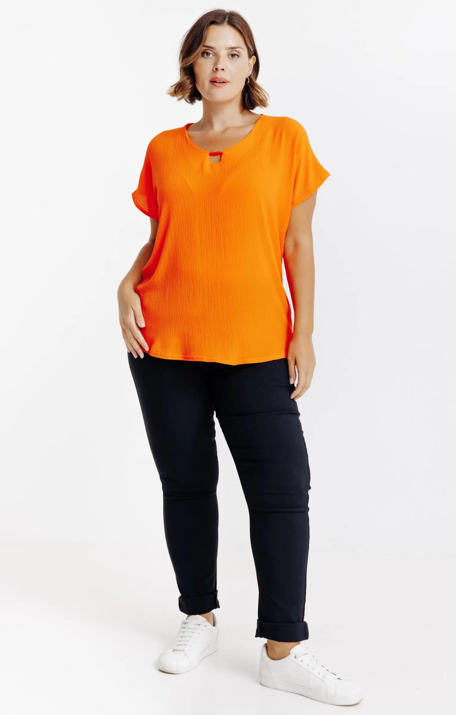 T-shirt uni à manches courtes et col rond avec détail décoratif. Coupe droite. Manches courtes à emmanchures tombantes. Base arrondie. Tissu à effet froissé.