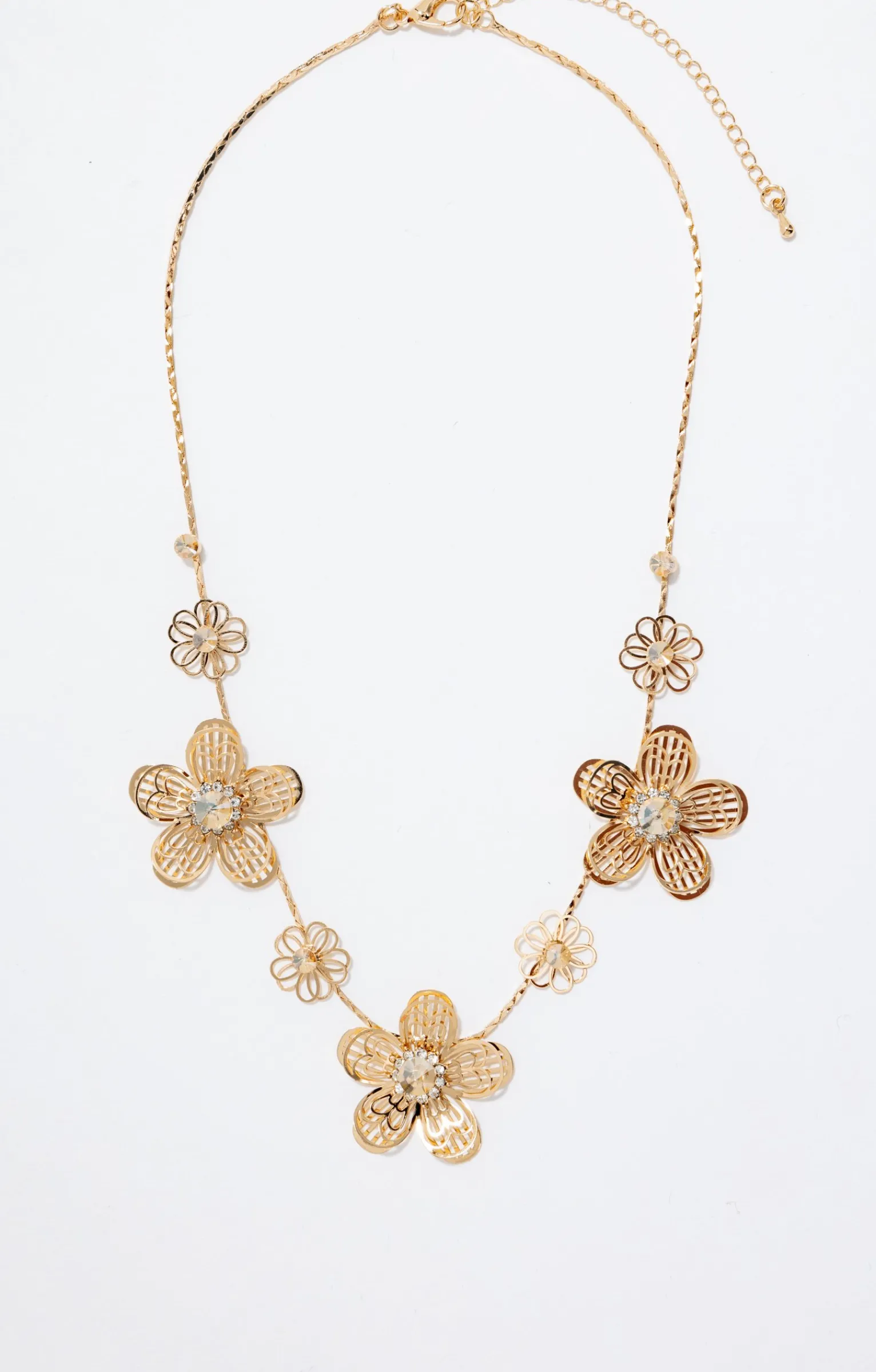 Collier à maillons fins avec pendentifs floraux ajourés de tailles variées. Fleurs en relief composées de pétales filigranés et ornées de strass au centre. Fermeture par mousqueton avec chaînette d’ajustement. Coloris uni.