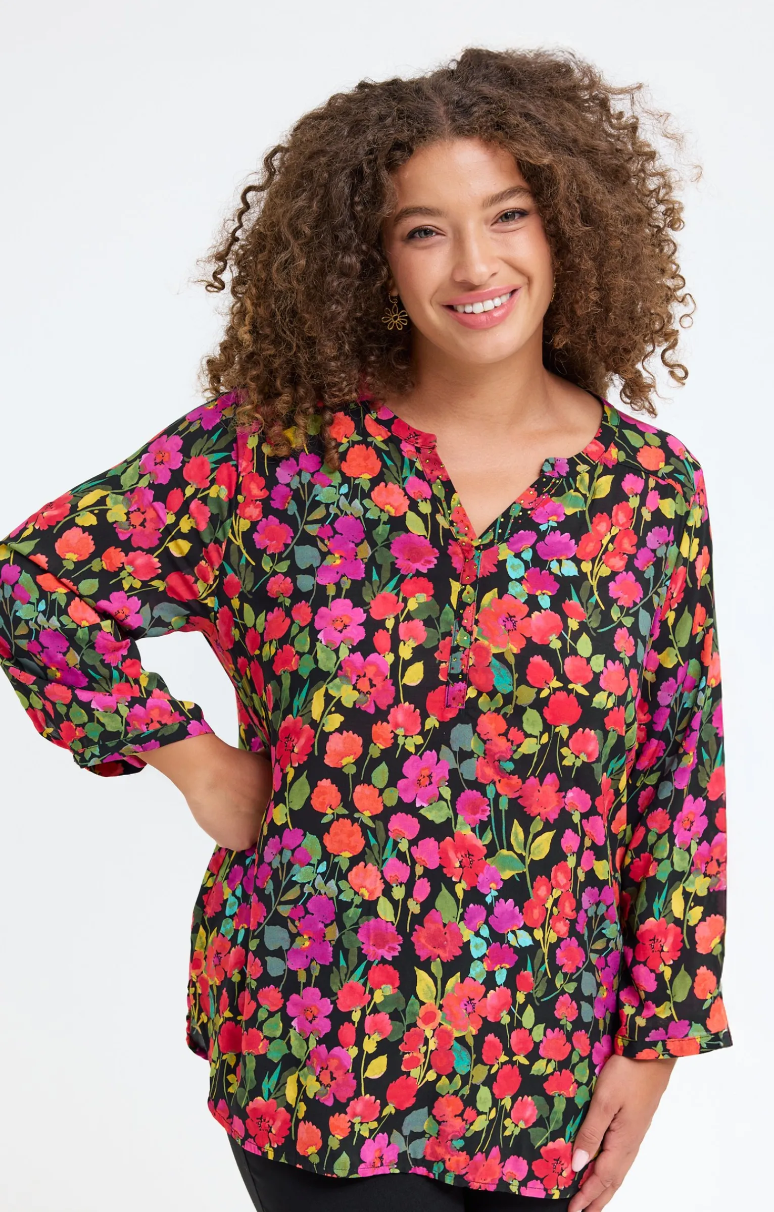 Blouse à fleurs multicolores. Coupe droite ample. Longueur sous les fesses. Manches 3/4 avec poignets boutonnés. Col avec découpe en V, orné de strass. Imprimé à motifs fleurs multicolores sur fond uni sur l’ensemble du modèle. Découpe horizontale dans le haut du dos. Composition 100 % viscose ECOVERO™.